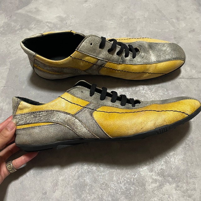 おそらくEUデザインのフットサルシューズのようなスッキリとしたボディのスニーカー 褪せたようなgrayとyellowの色味がcool size 42 (26.5〜27cm)