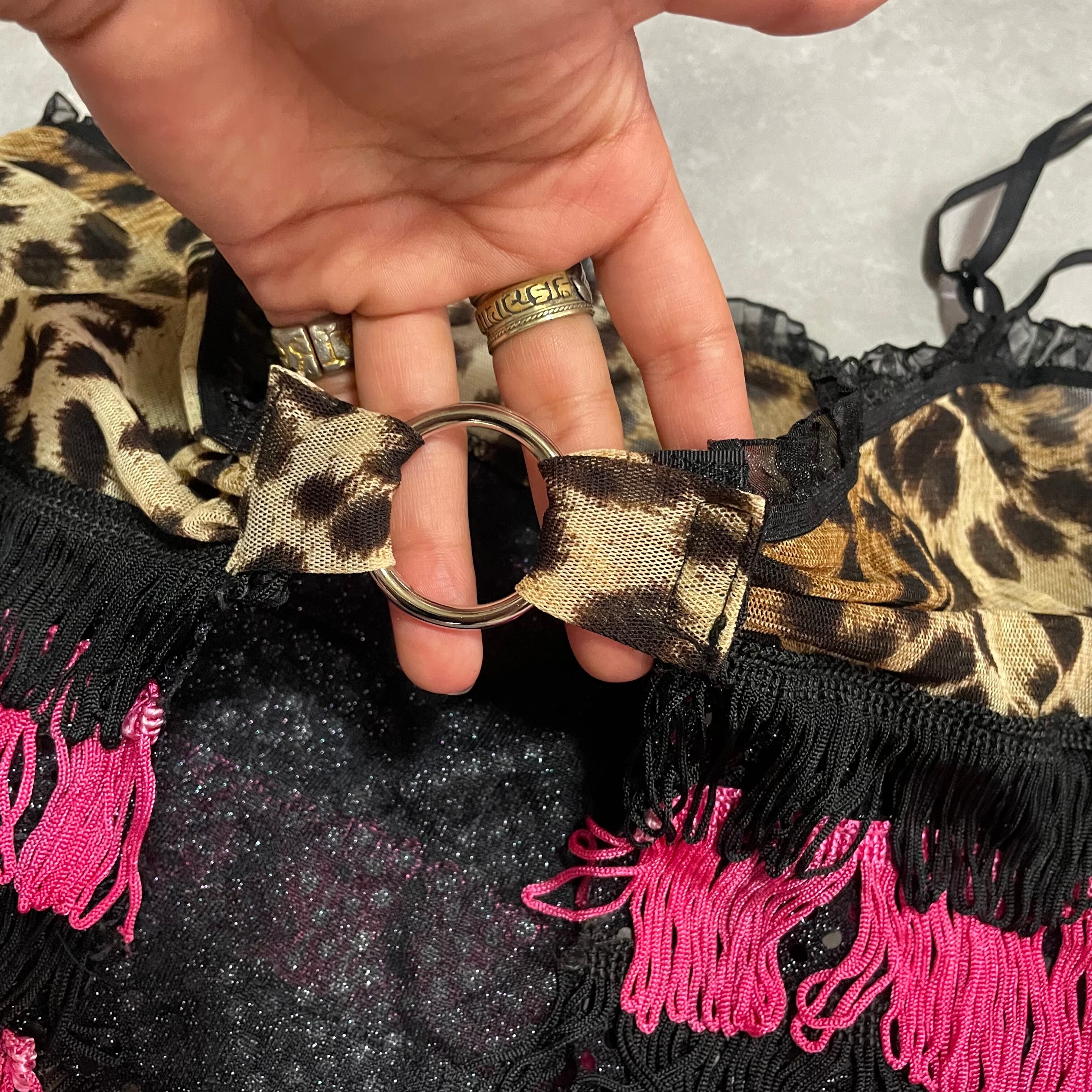 シアーなレオパード柄と悪趣味なカラーのフリンジが強めデザインのcamisole