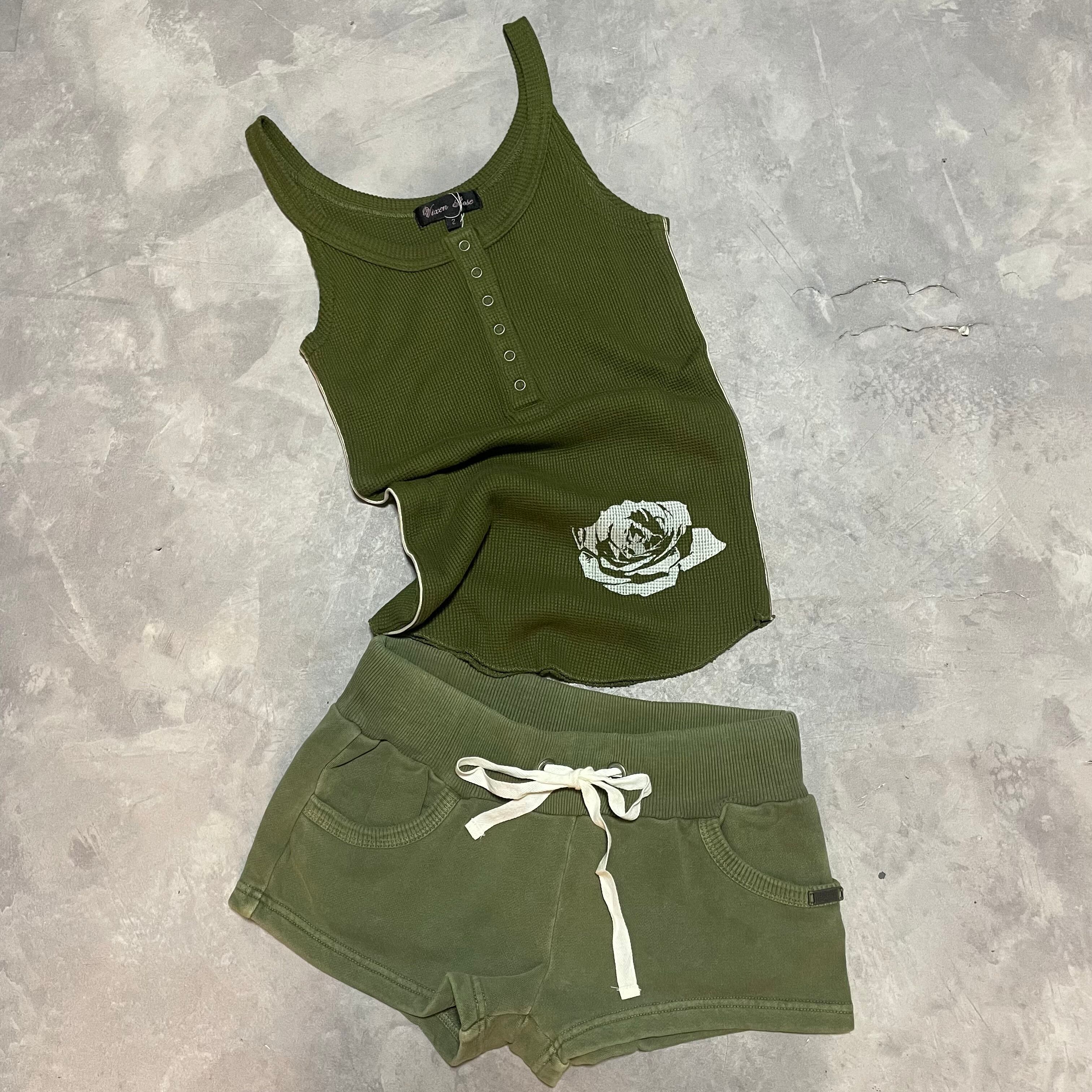 ワッフル素材のベーシックなtank topにローズのプリントがcoolなタンクトップ