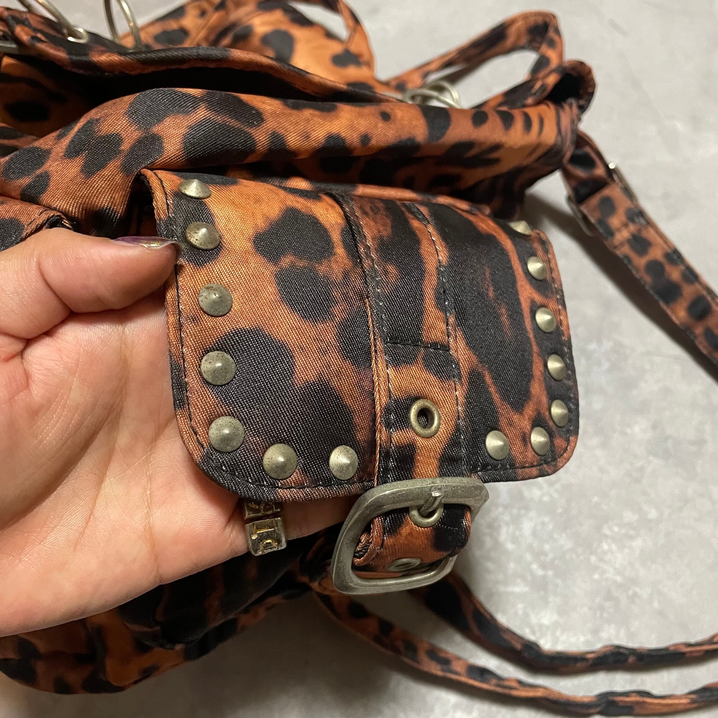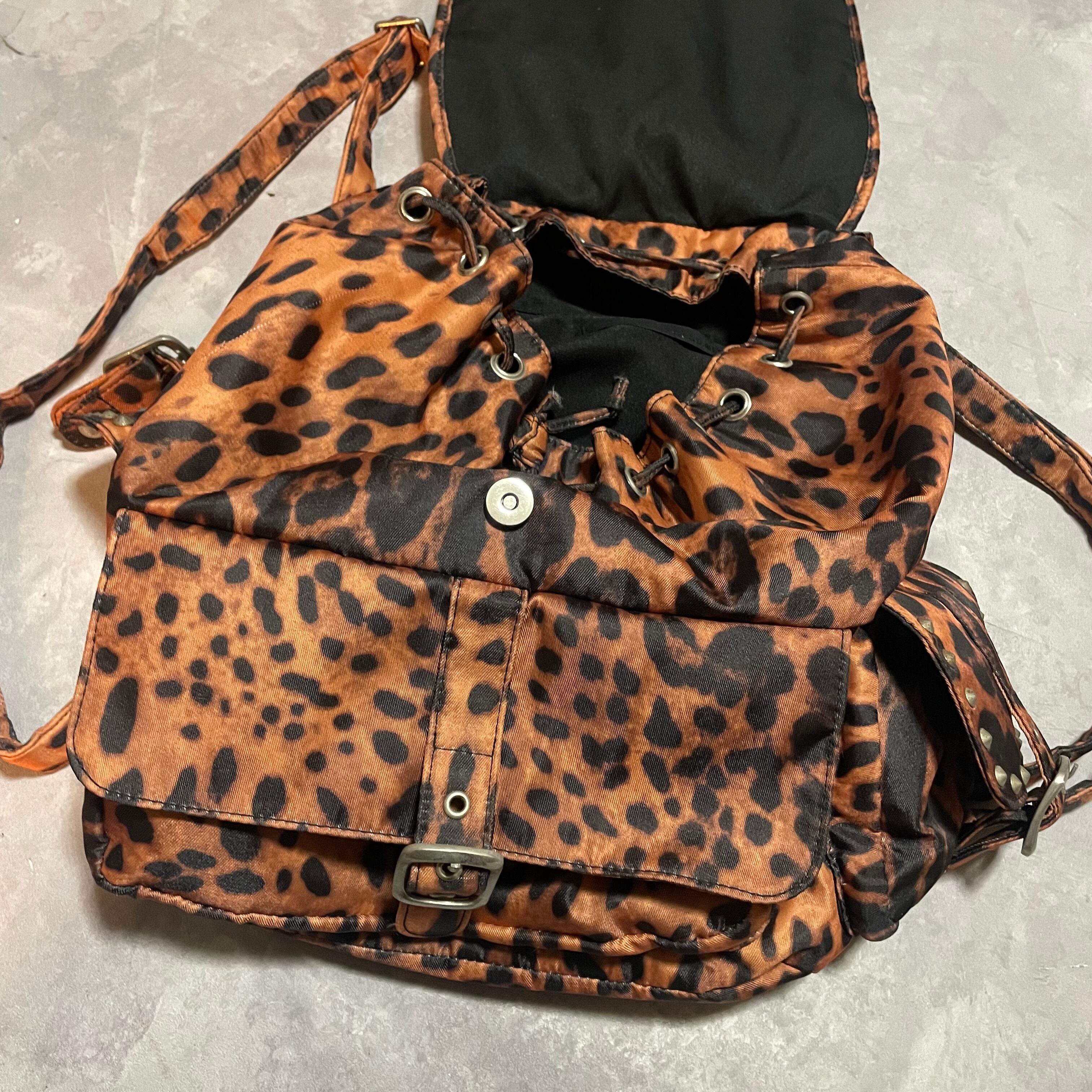 hardなレオパード柄にスタッズや金具のデザインがアバンギャルドな雰囲気のリュックサック