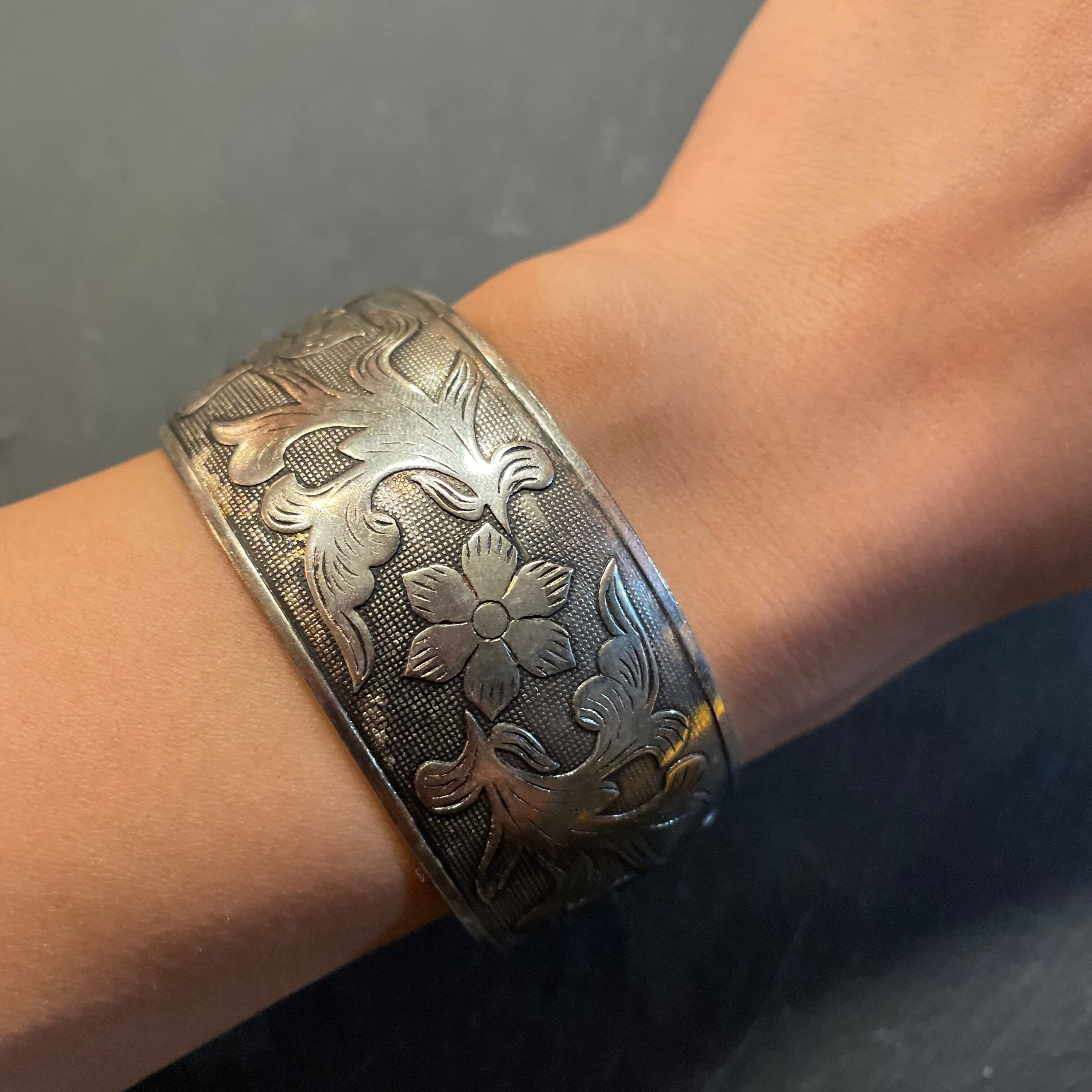 ボタニカル柄の彫刻がcoolなシルバーバングル