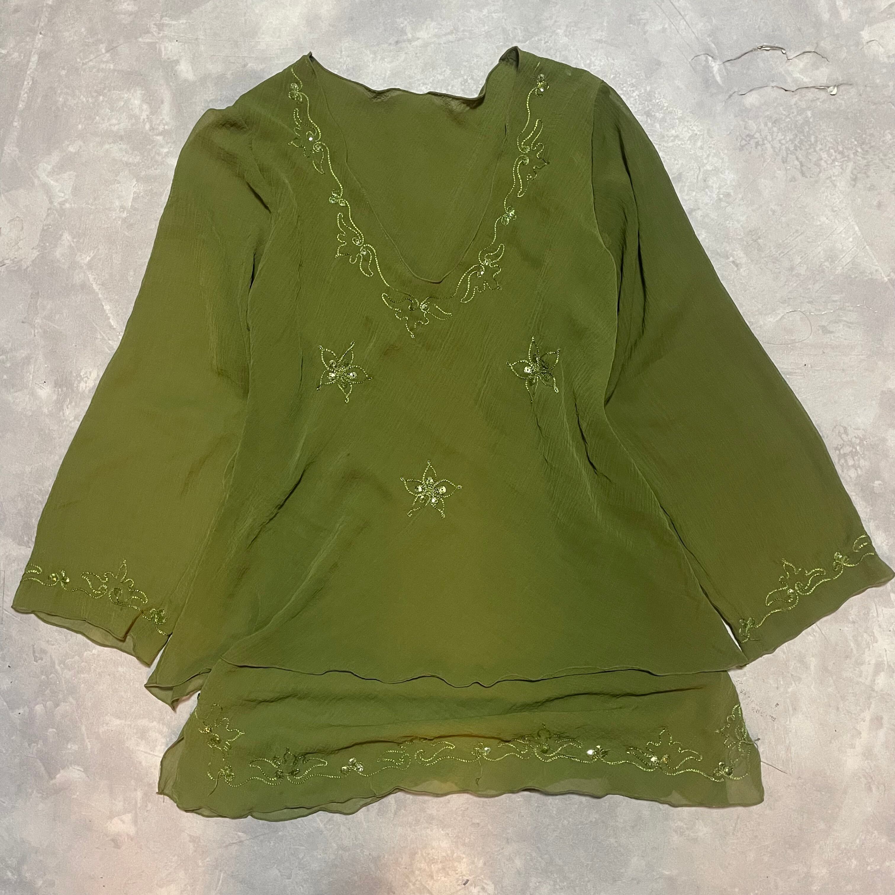 シアー素材の鮮やかなgreenが綺麗なチュニック丈ブラウス