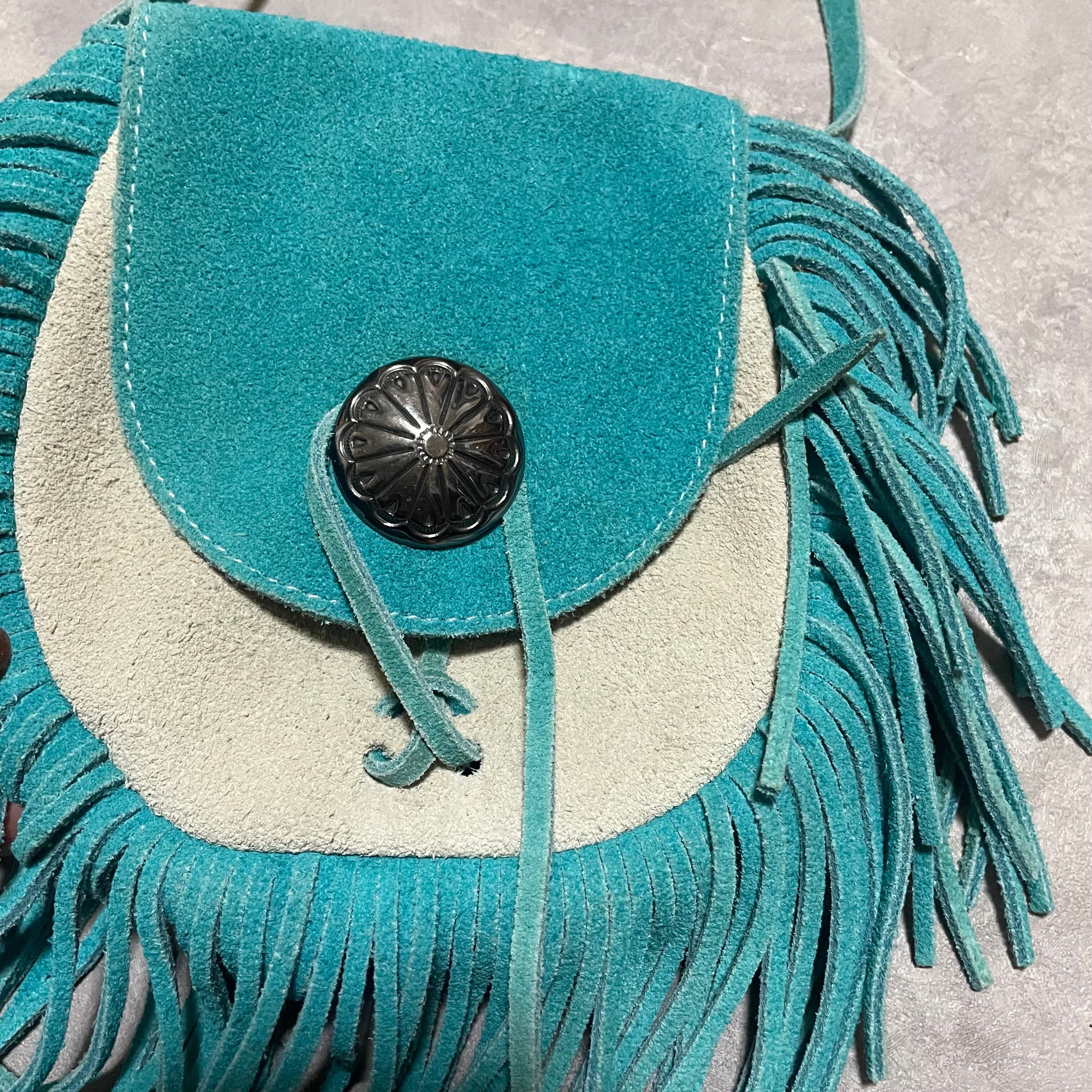 鮮やかなターコイズのカラーが目を惹くコンチョボタンのバッグ