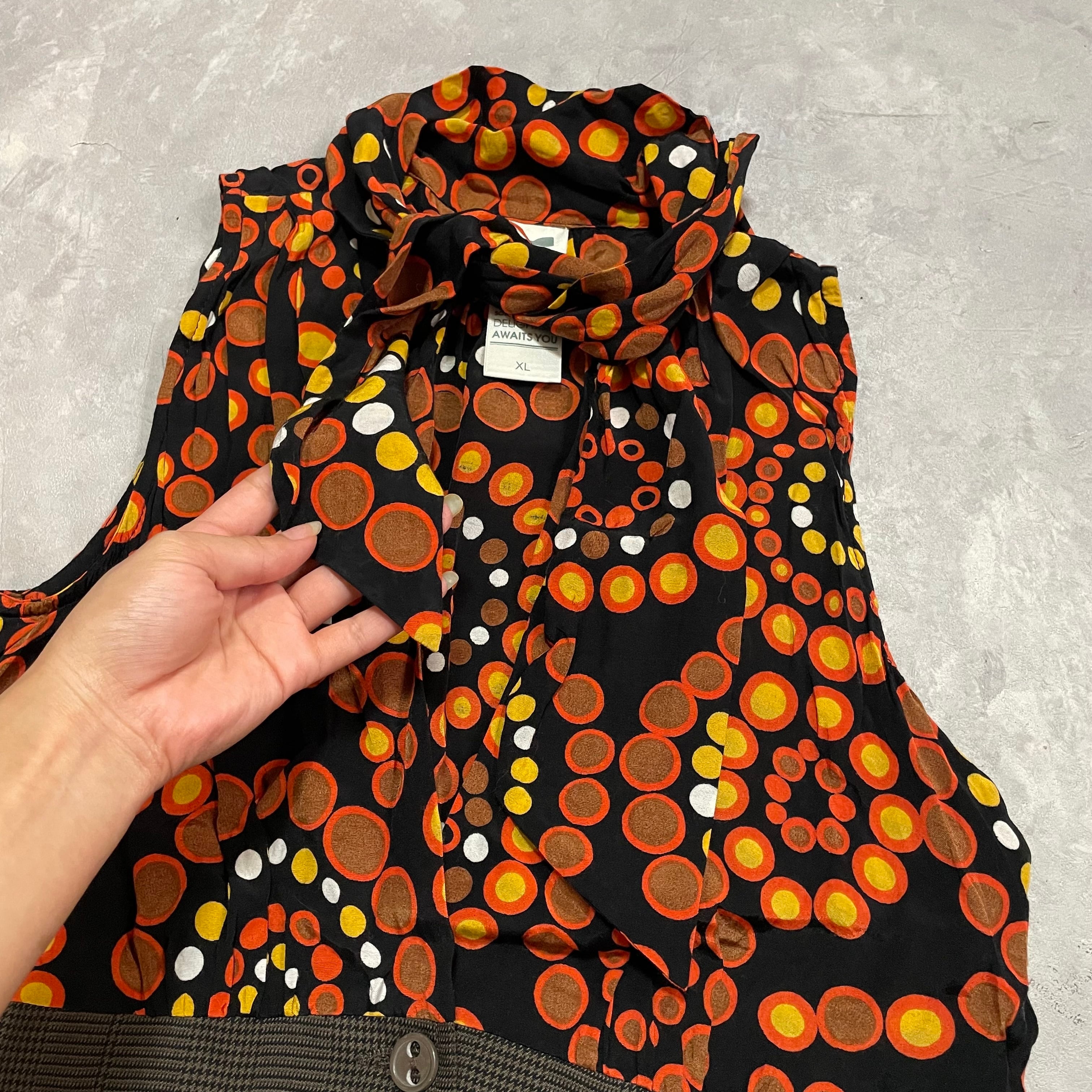 レトロポップな柄にシックなチェック柄の切り替えがマッチしたベスト