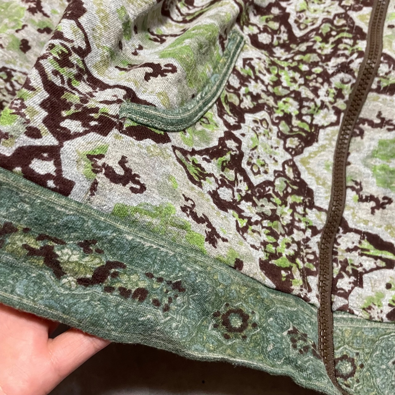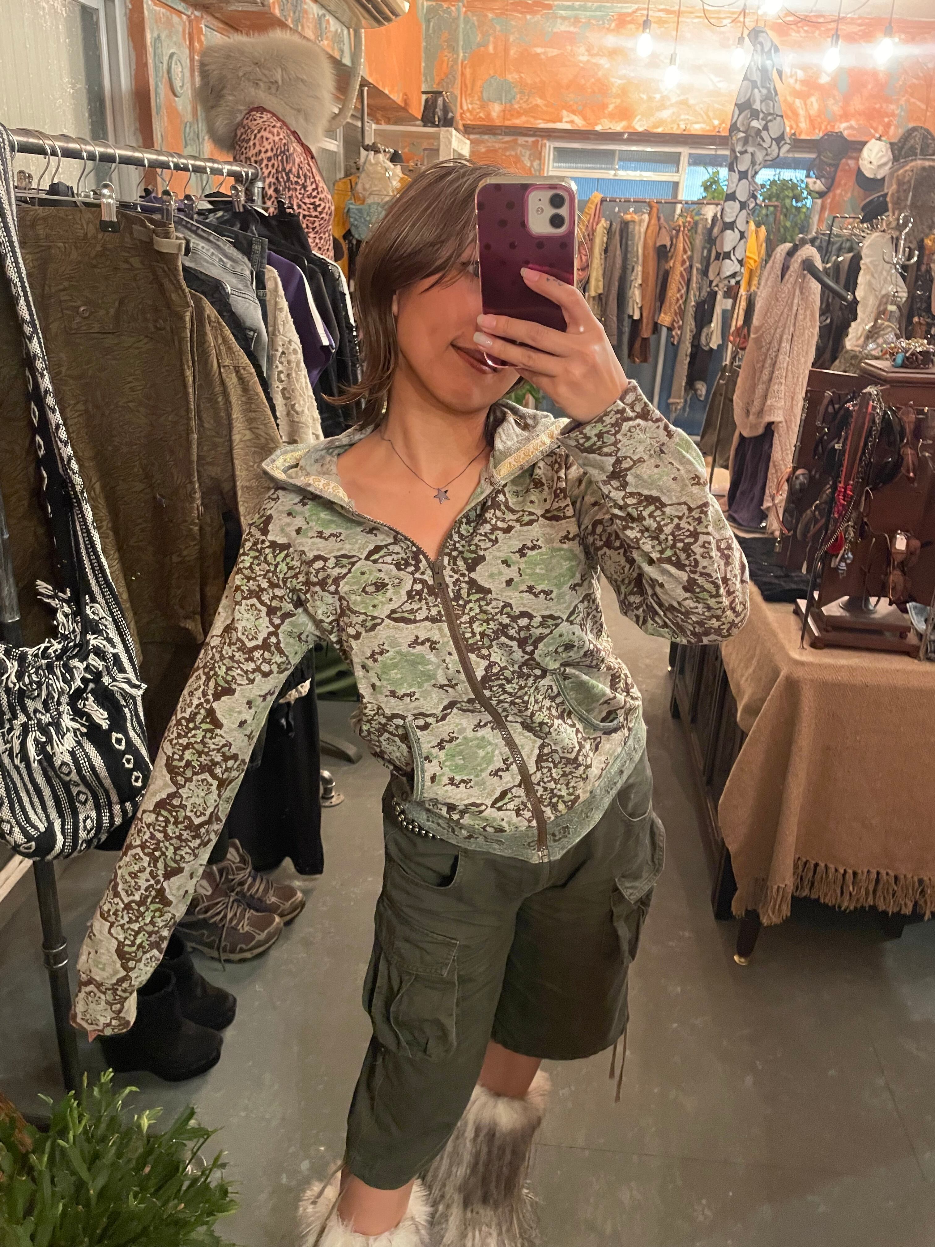 ボタニカル柄とレースが合わさったような不思議な柄がキュートなフーディ