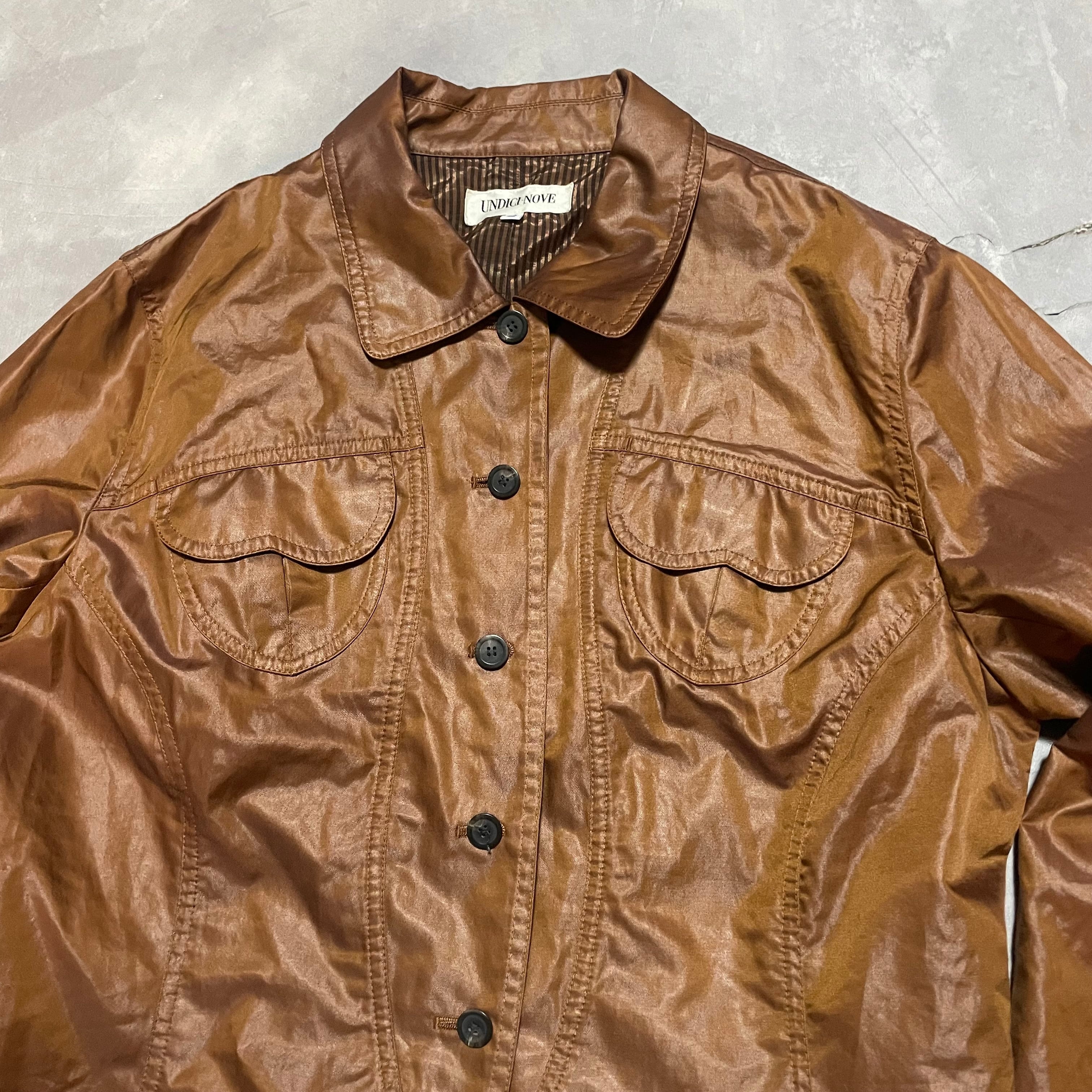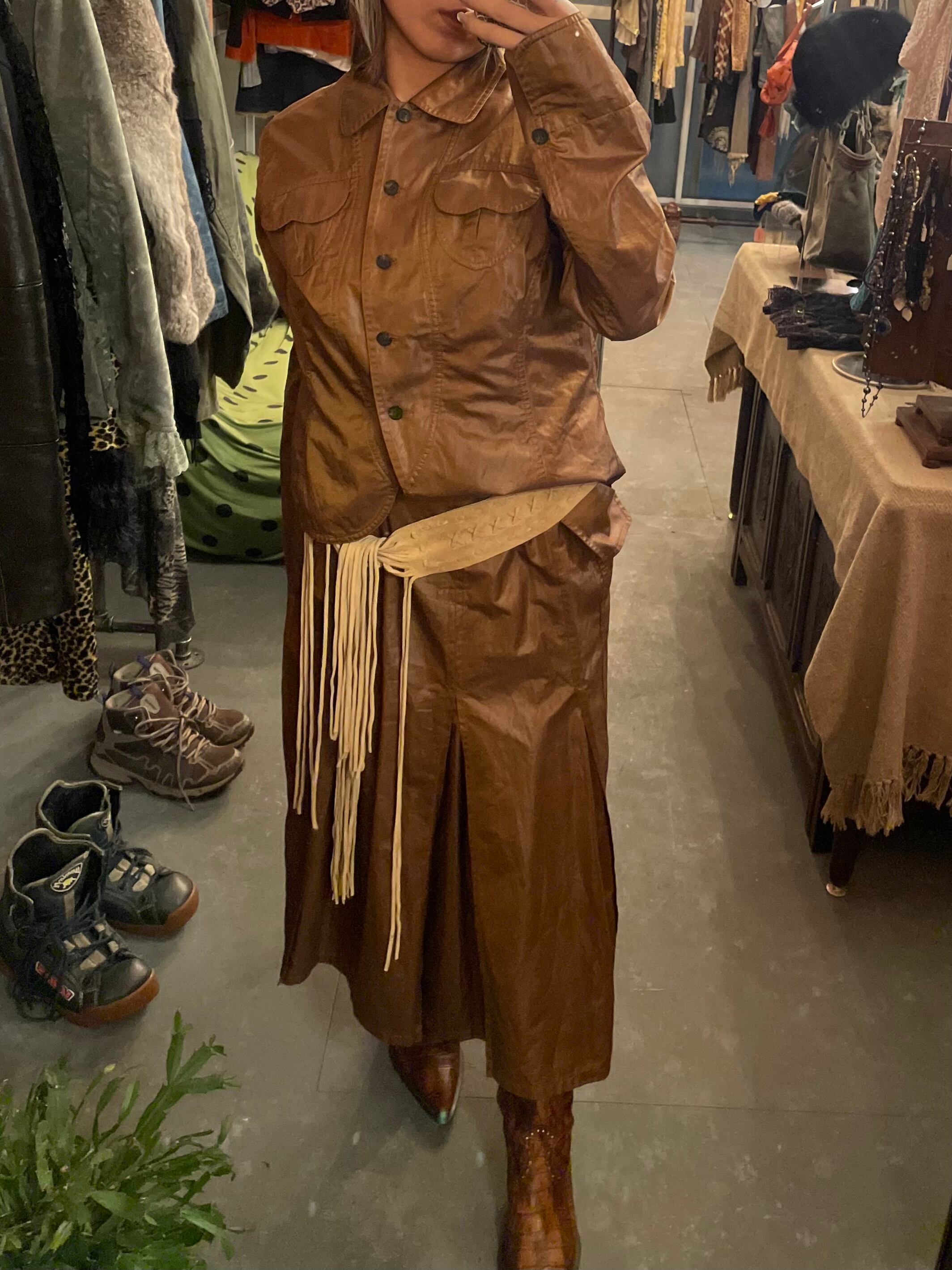 光沢のあるレザーのような素材が珍しく、高級感のあるシャツセットアップ