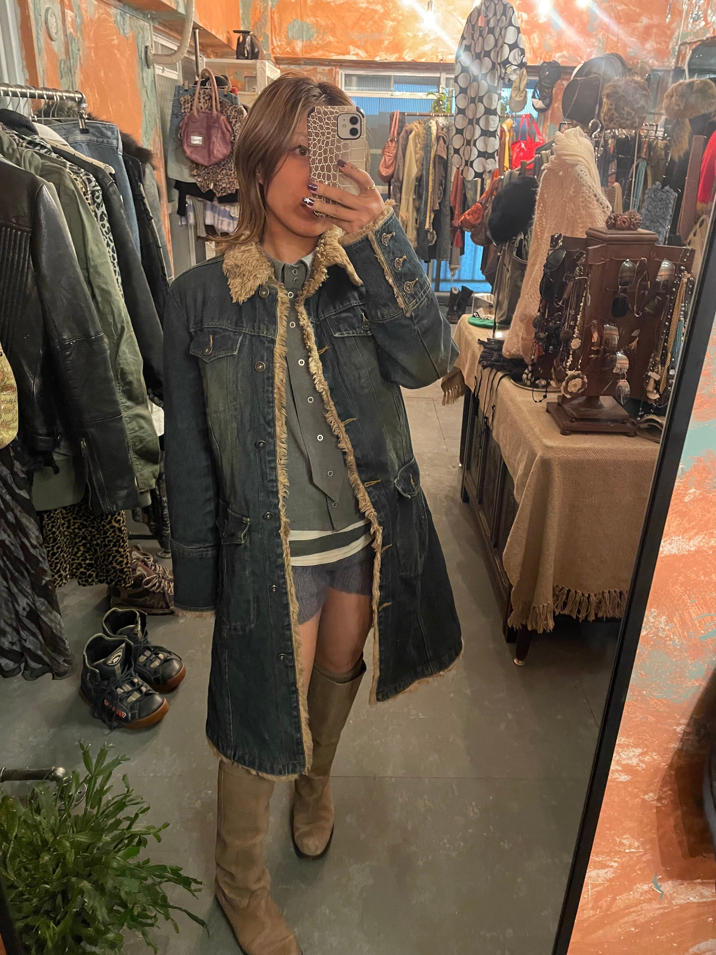 ボア× denimの素材がマッチしたカジュアルなロングコート