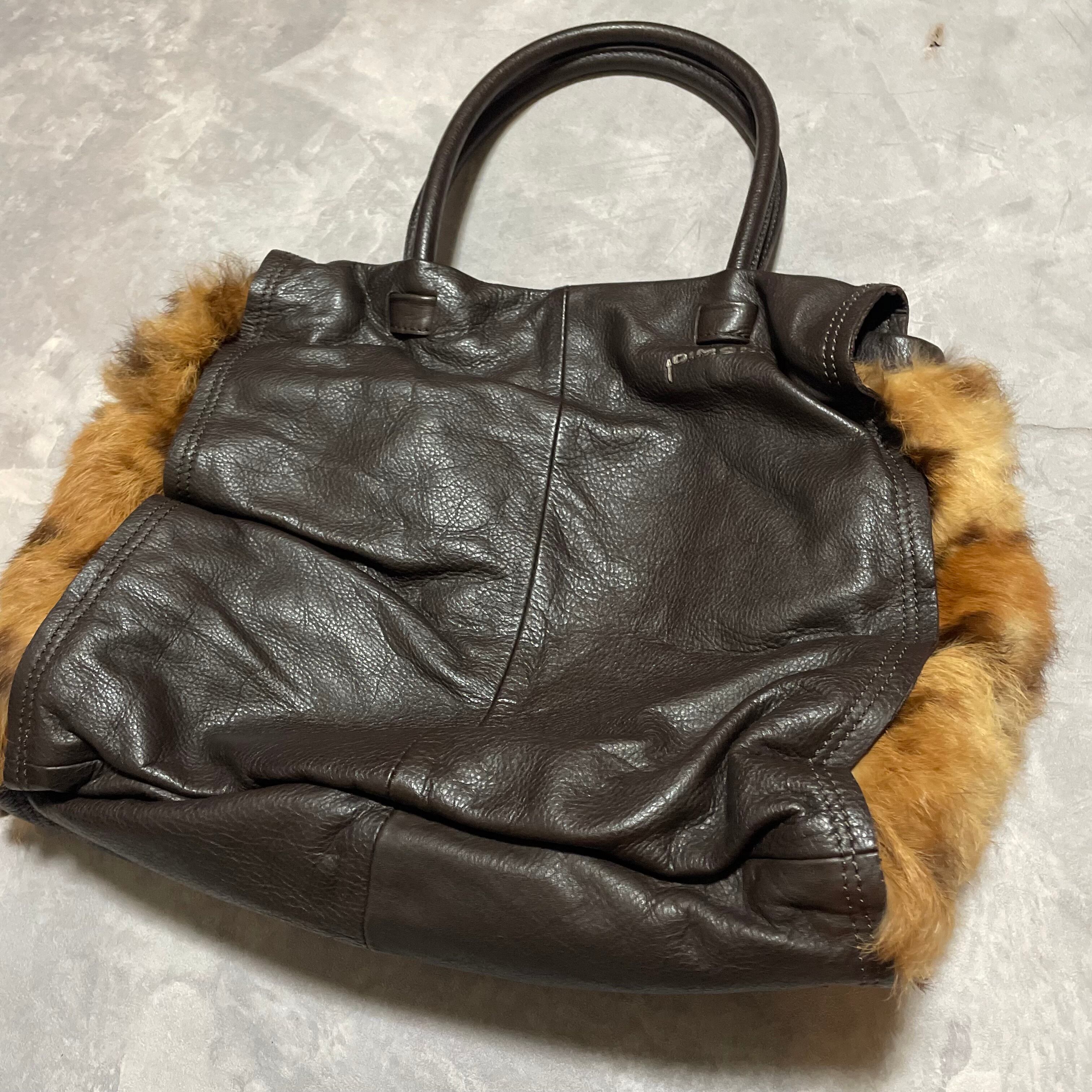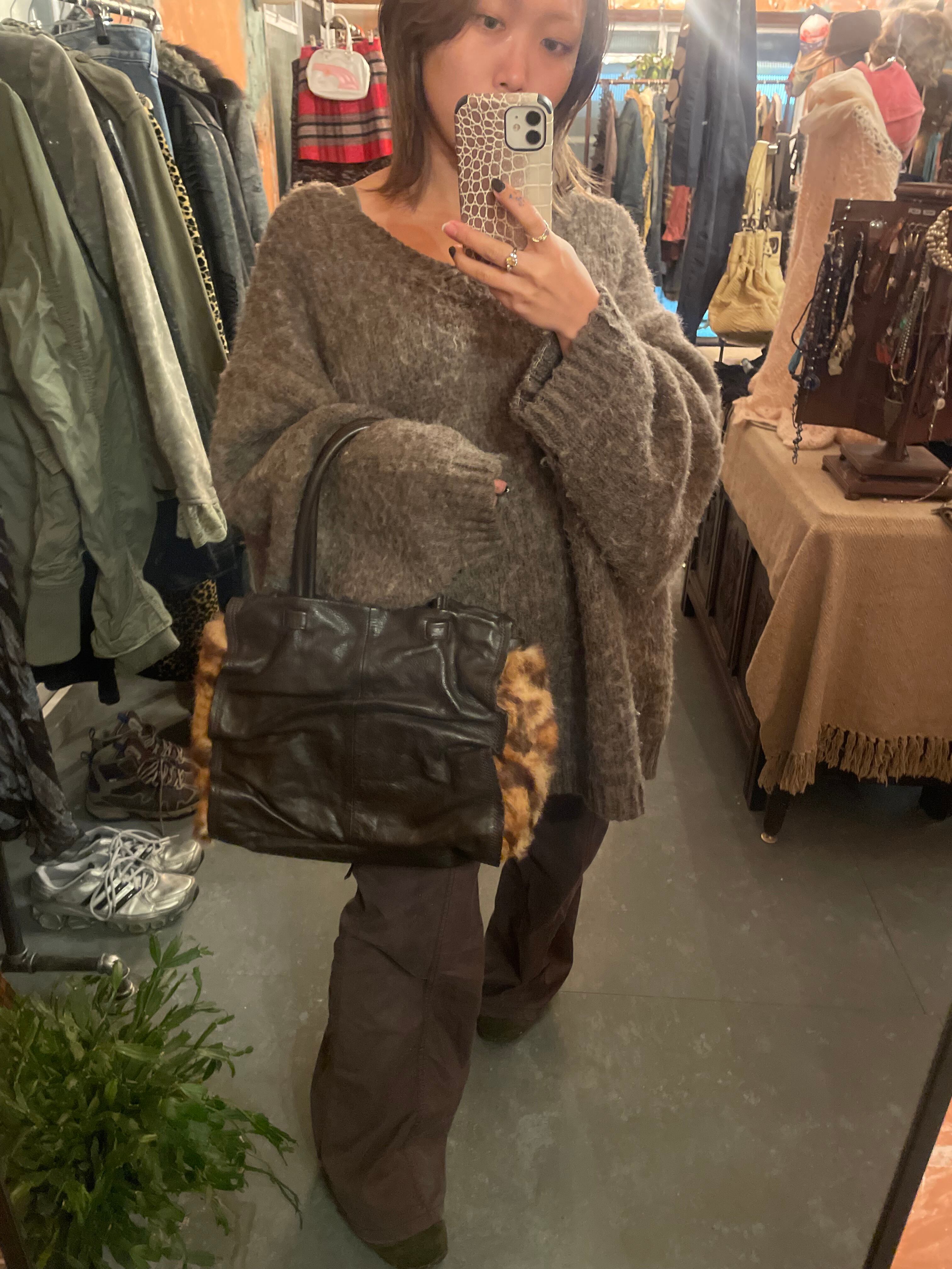 レオパード柄のリアルファーがデザインされたleatherのハンドバッグ