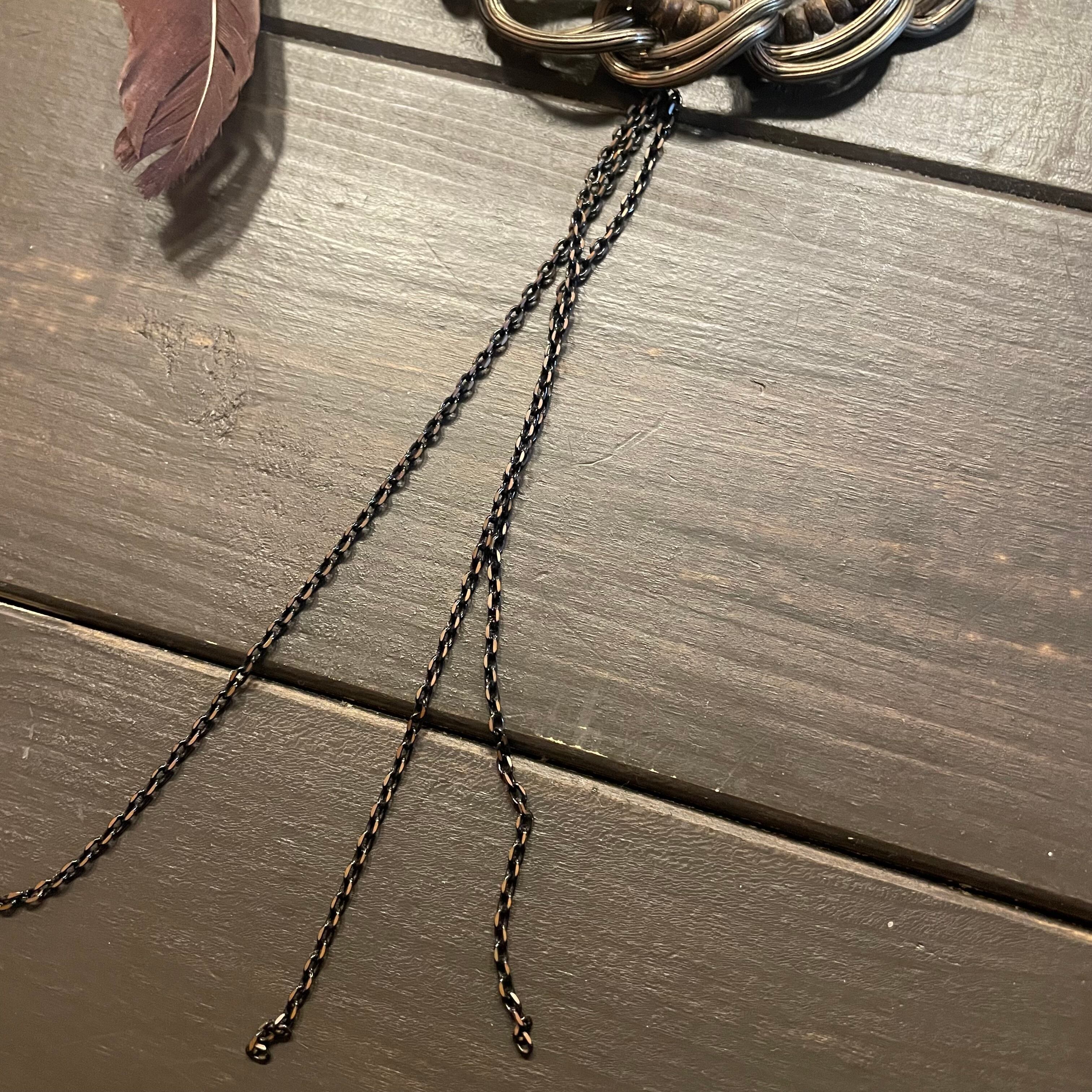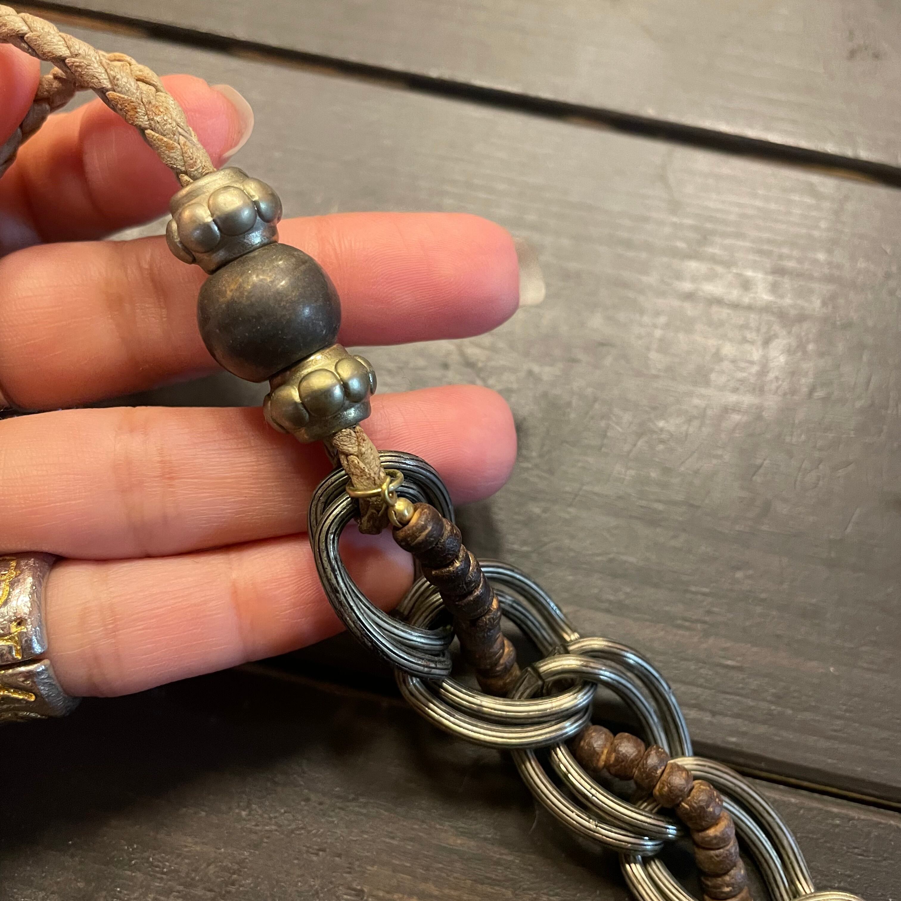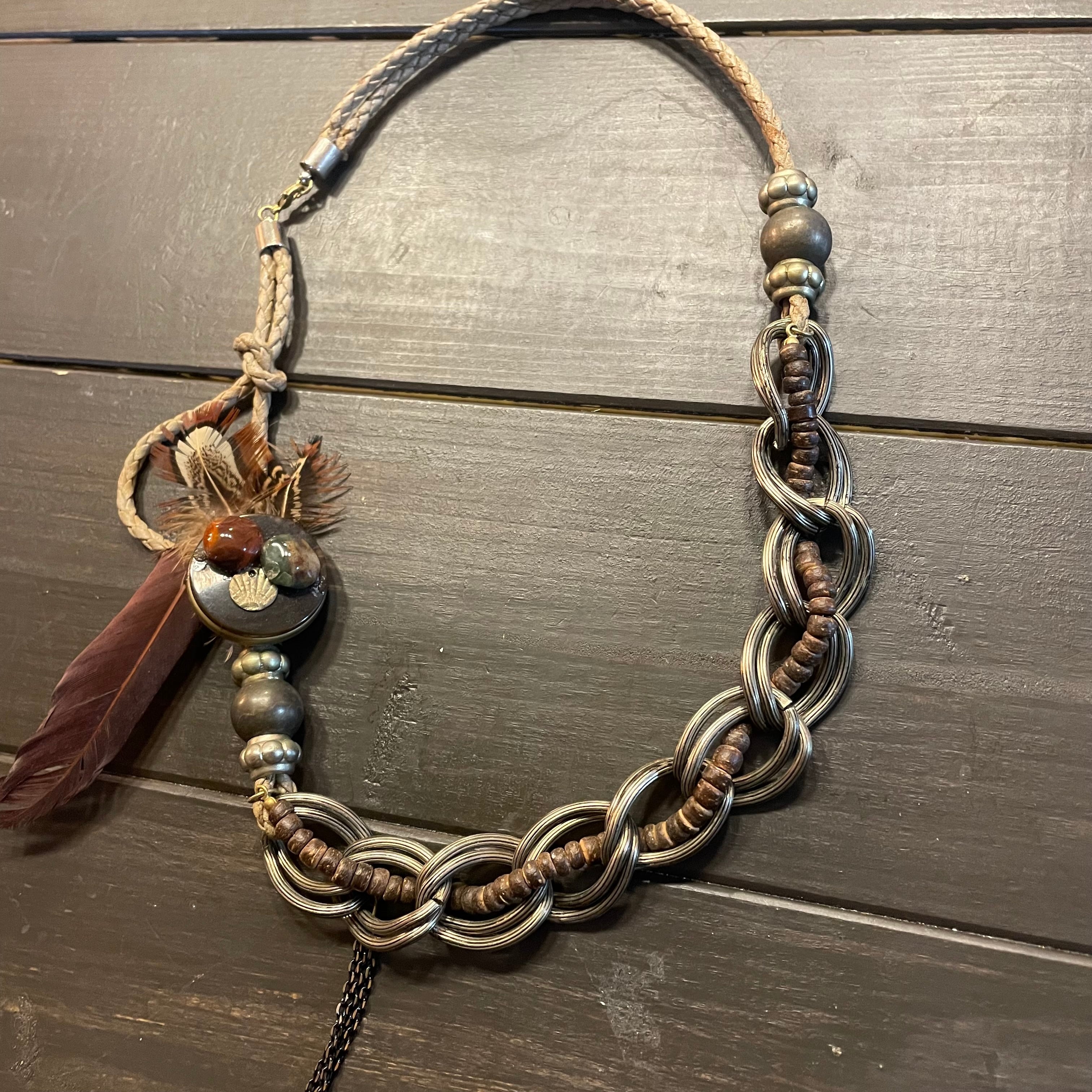 レザーの編み込みを土台にフェザーや金具のmotifがcoolなネックレス