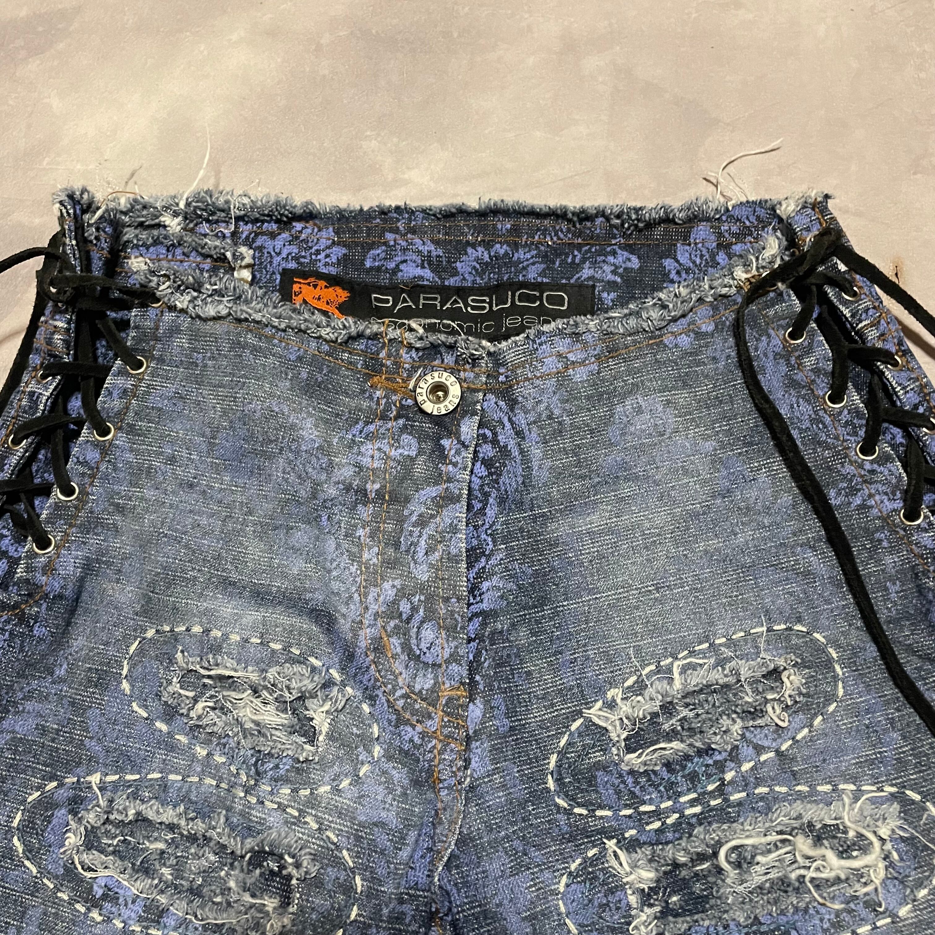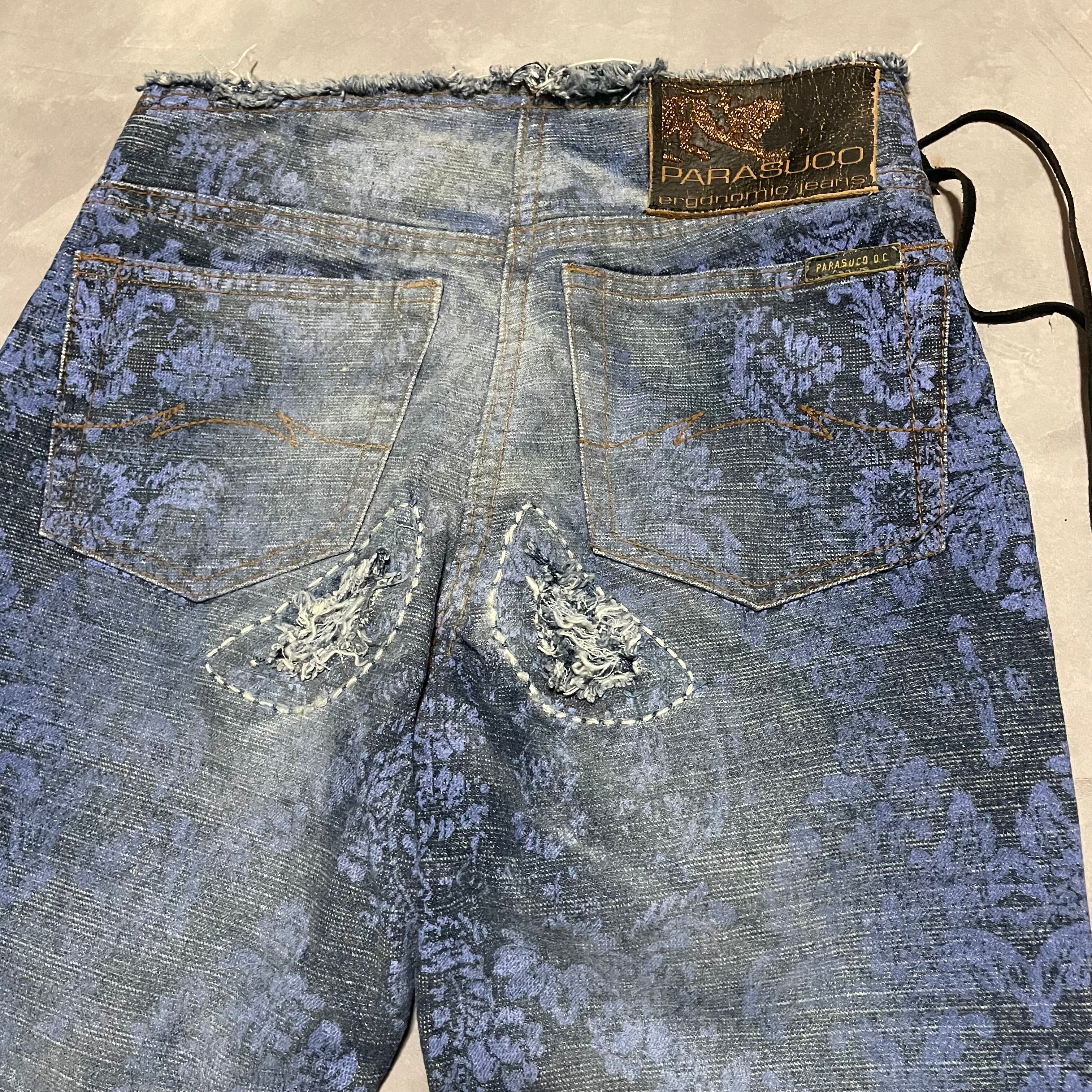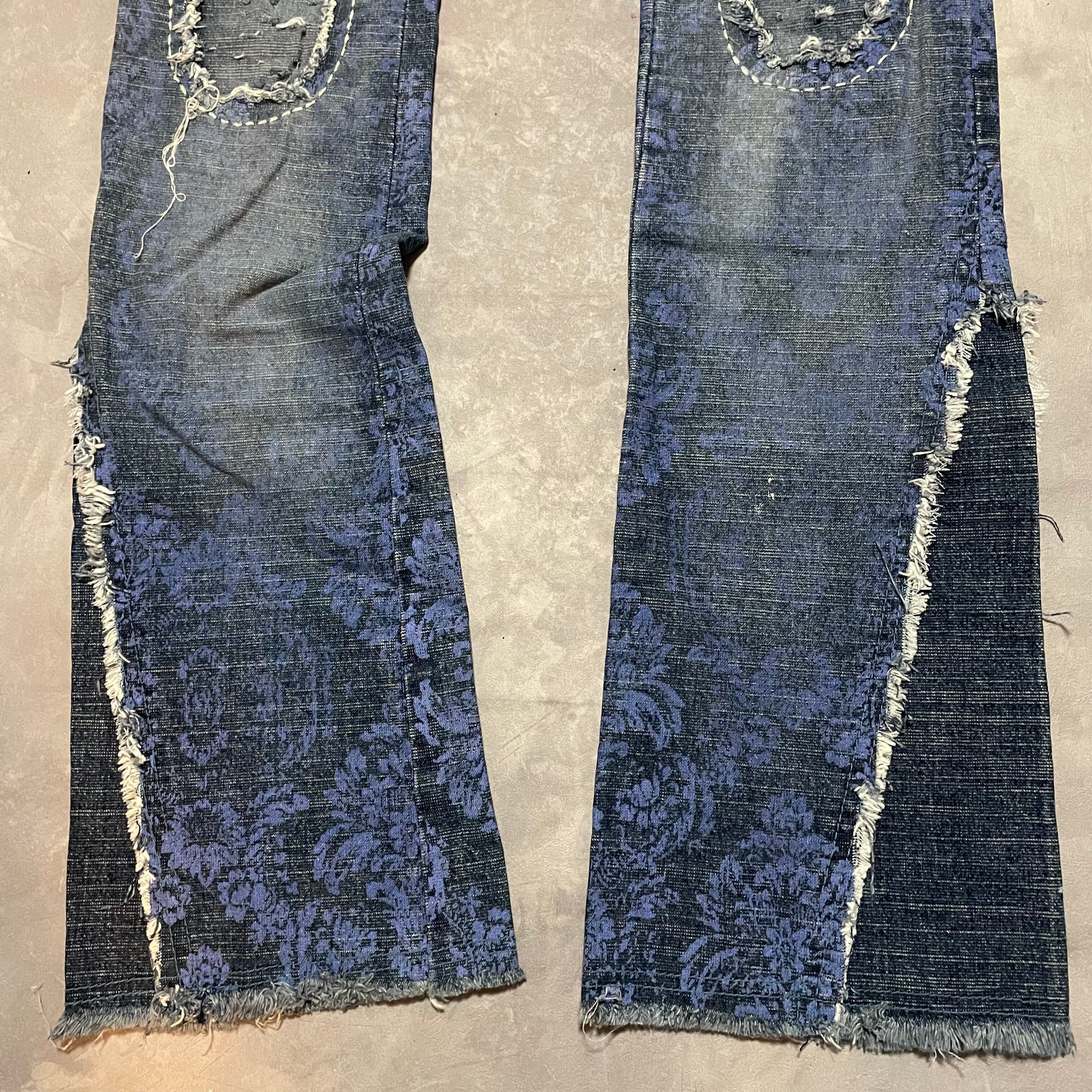 青みのあるflower柄にダメージのデザインがcoolなフレアjeans