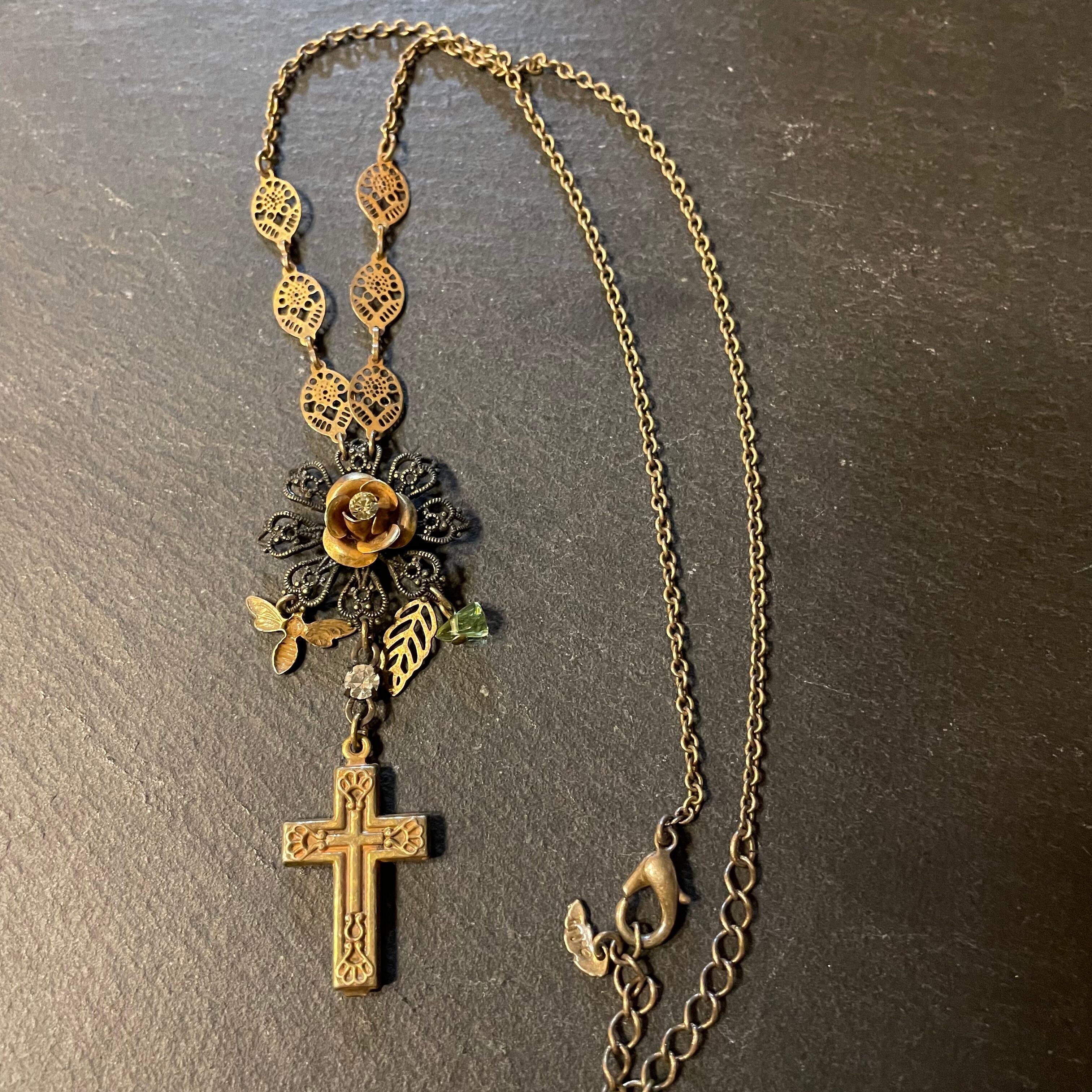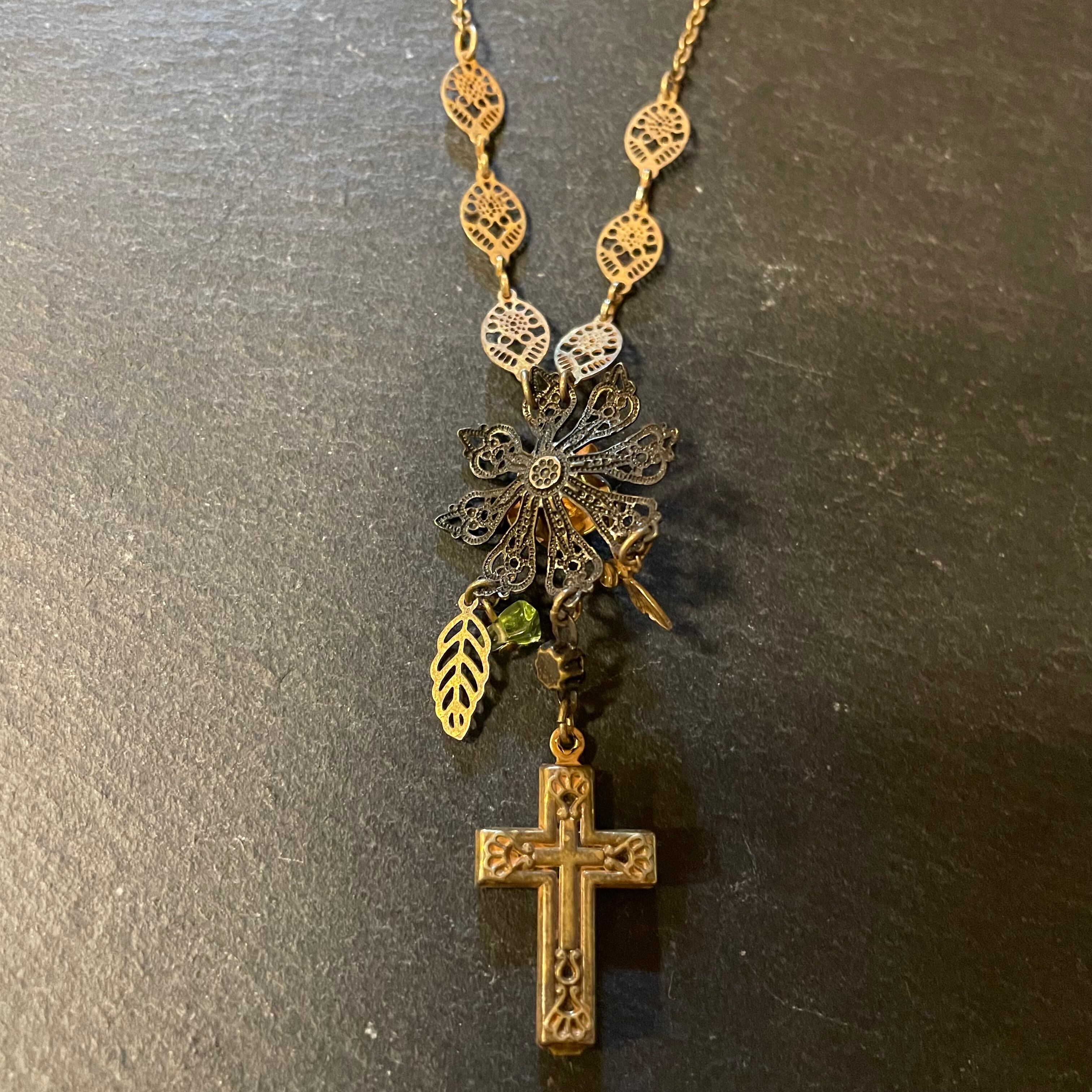 ビンテージgoldを基調としたクロスやローズのモチーフが繊細なネックレス