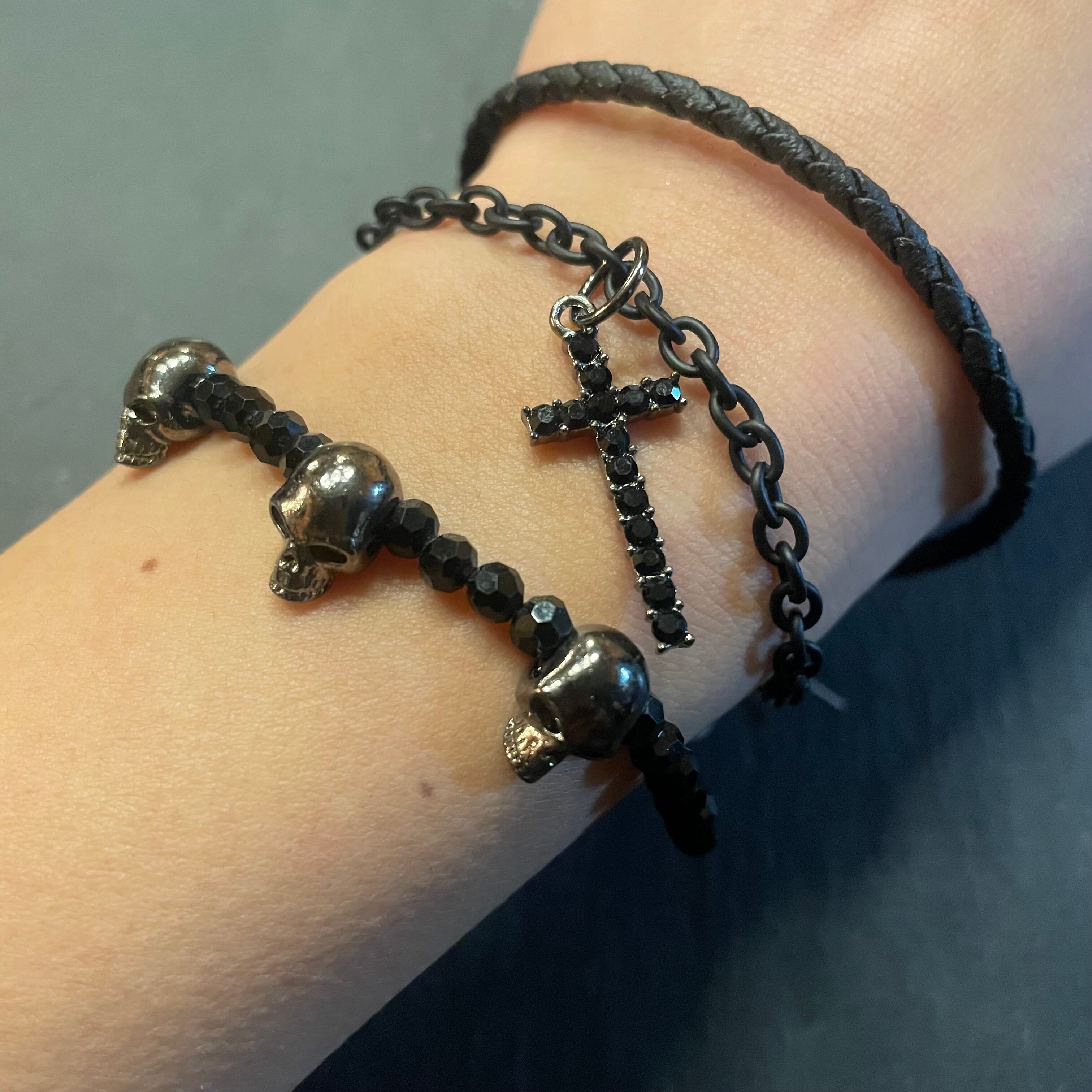 ブラックを基調としたスカルやクラスのモチーフ、レザーにbeadsが合わさったブレスレット