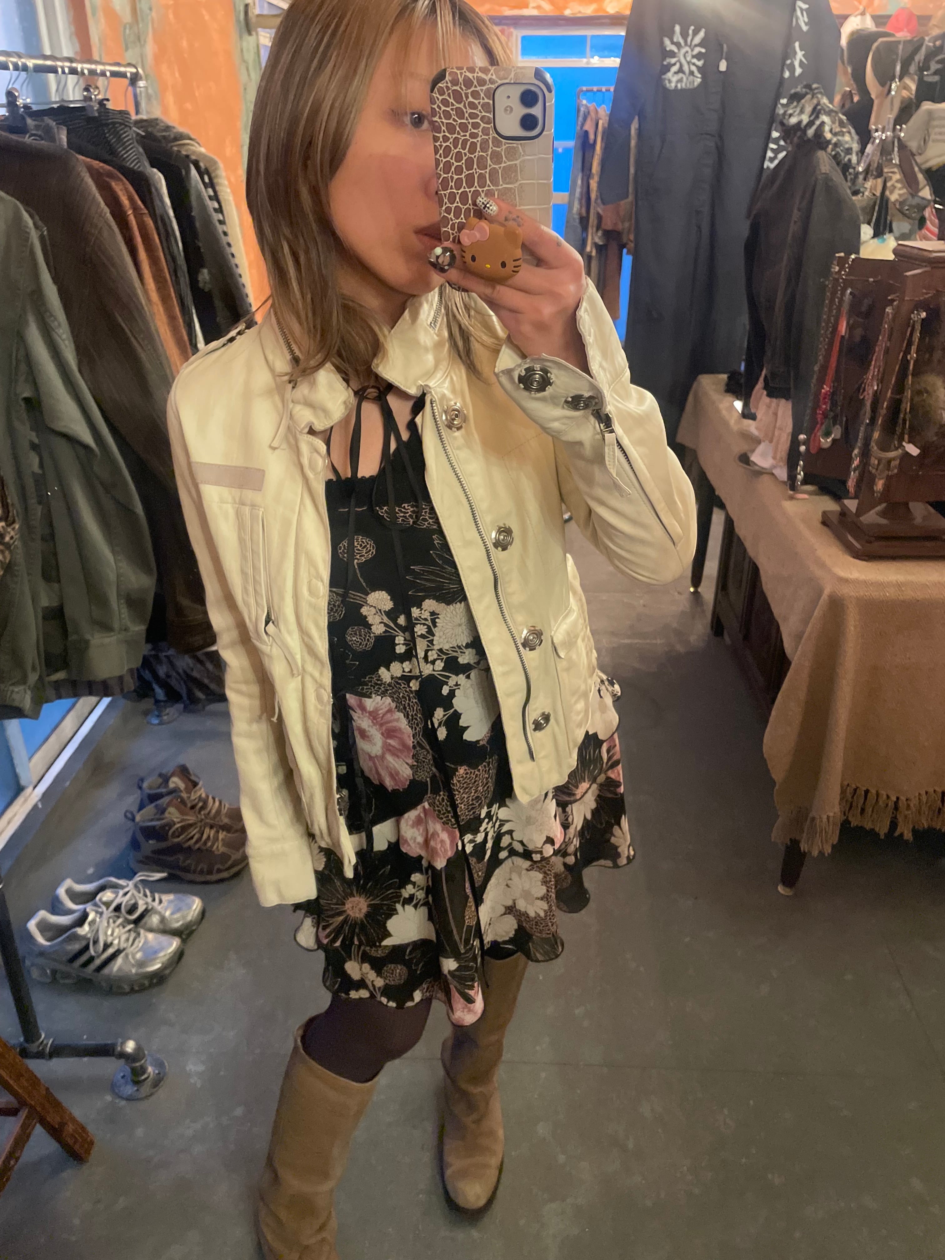 ホワイトのラムレザーにボタンやファスナーのgimmickが coolなレザージャケット