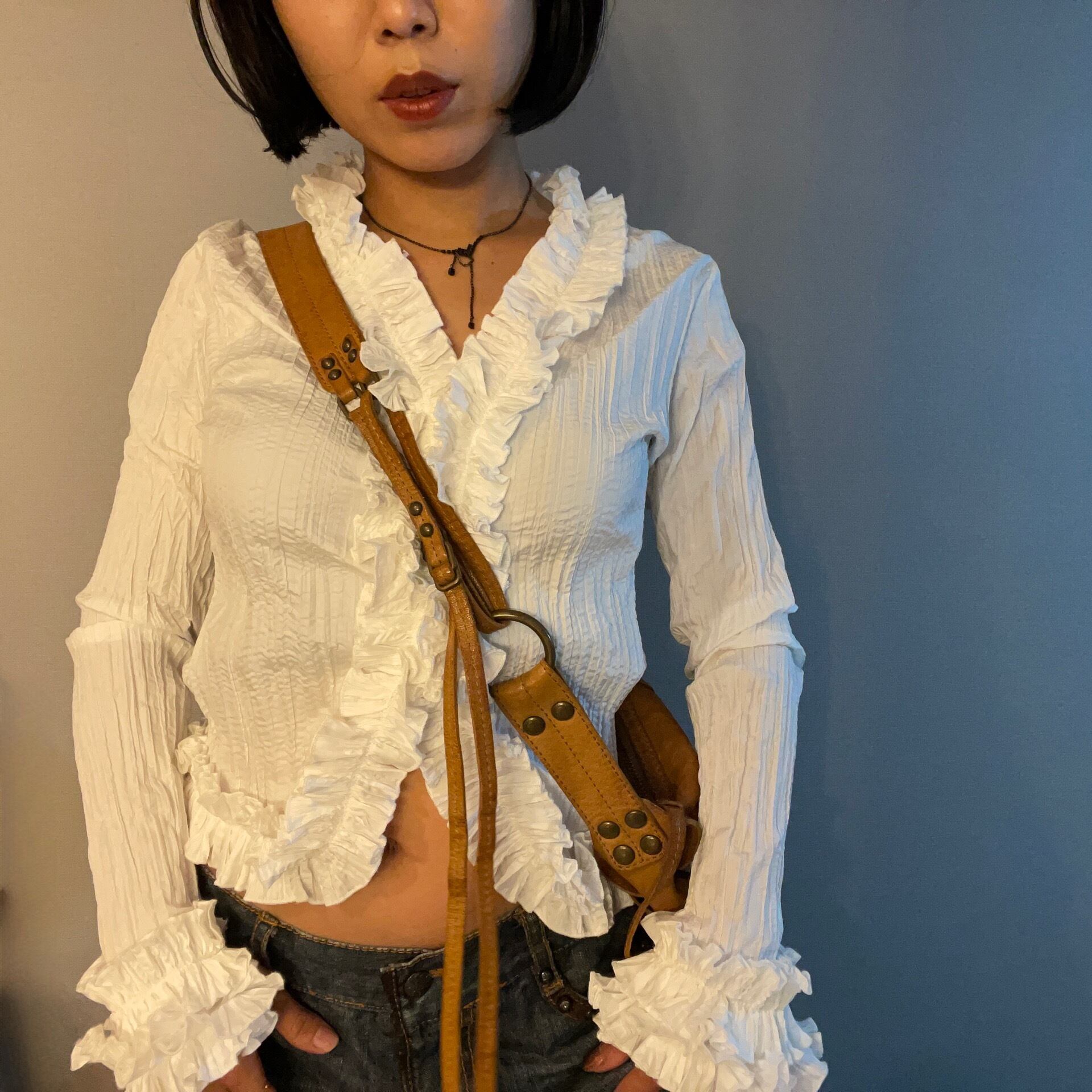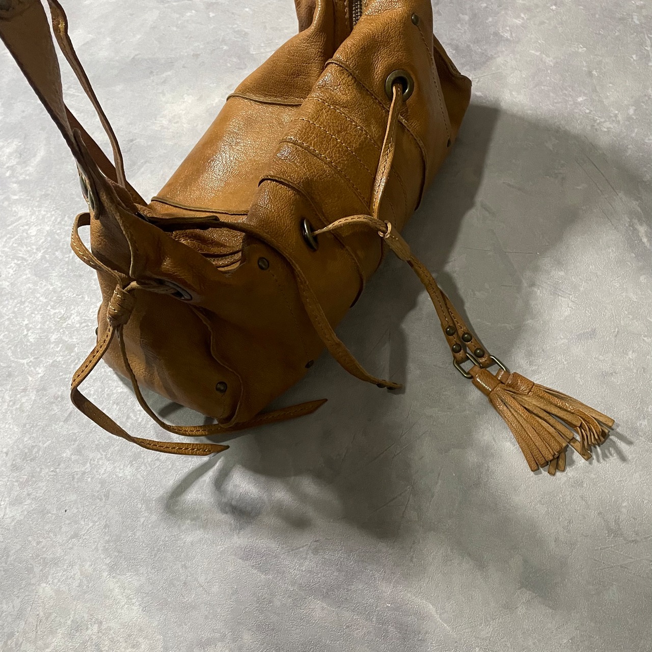 camelのカラーとtassel、studsの細かいディテールが目を惹くreal leather bag