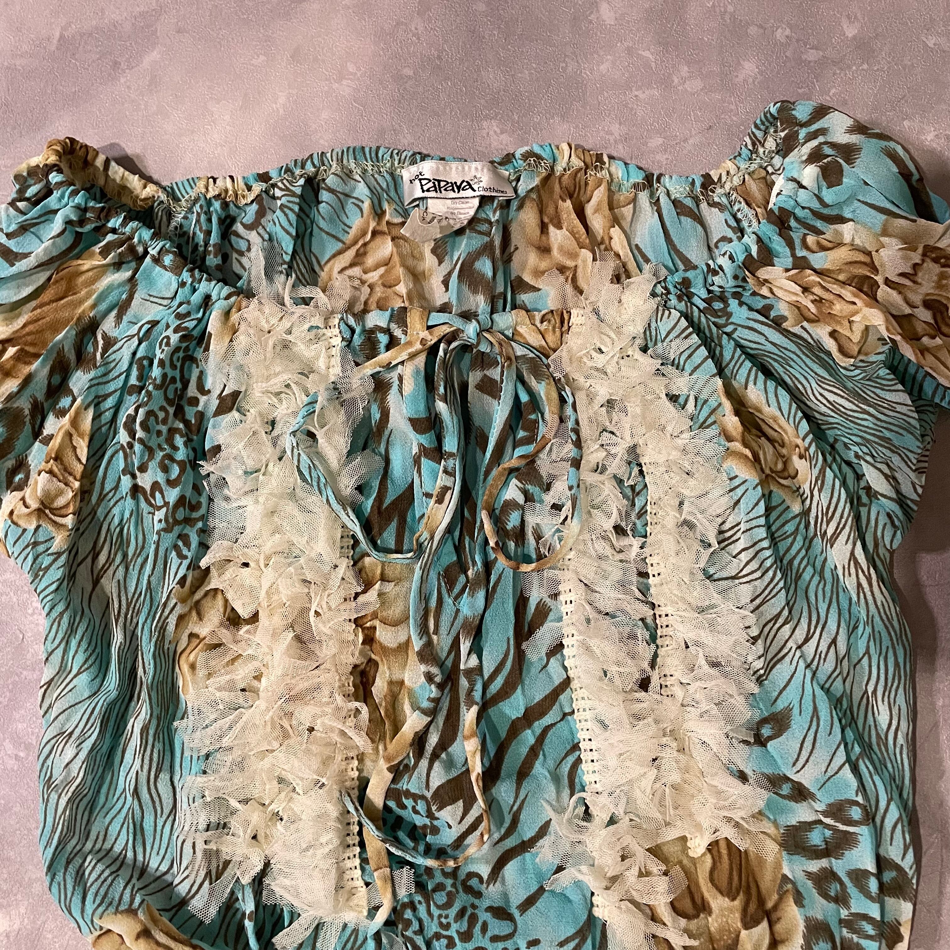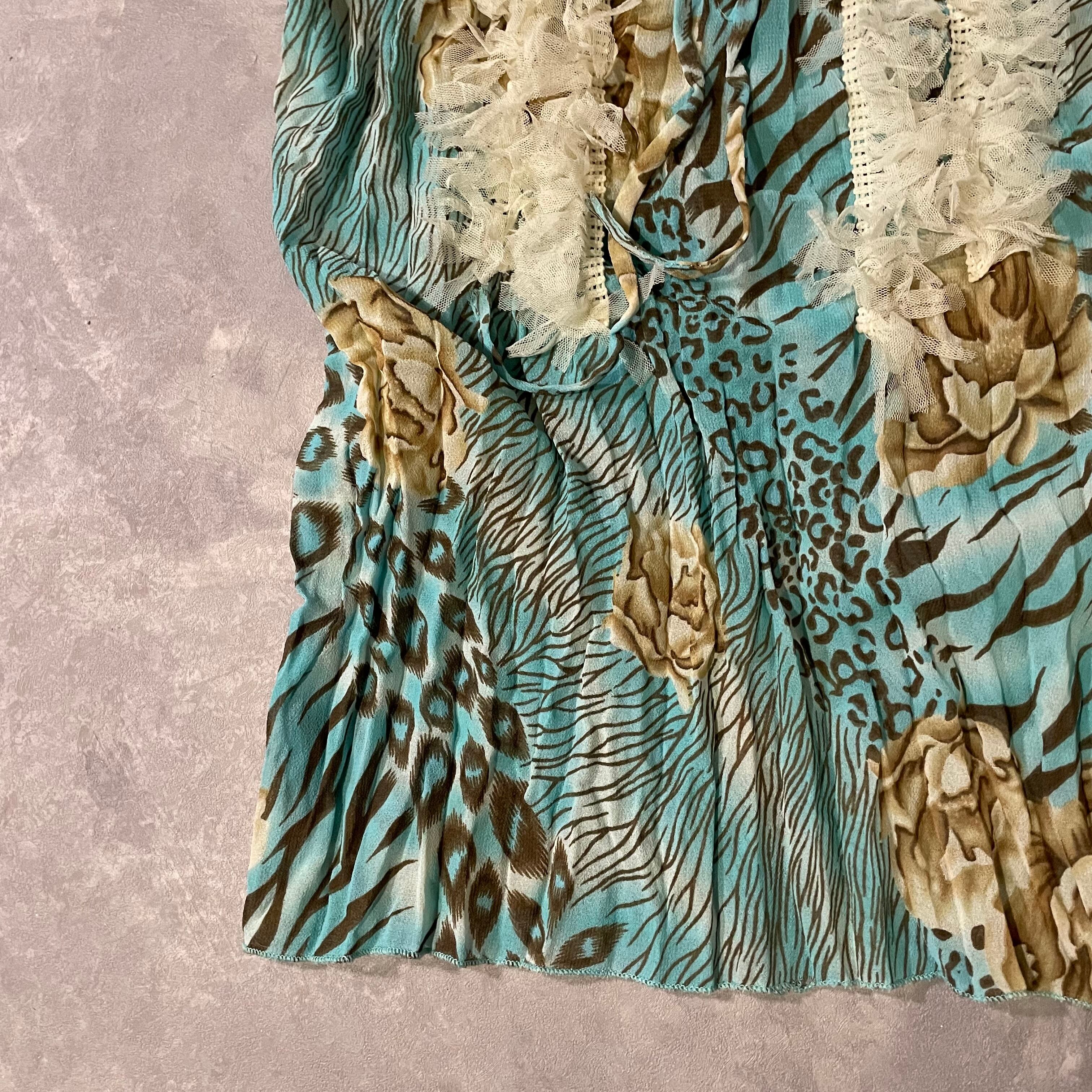 animal柄のプリーツの上にたっぷりのフリルdecoration、一枚で存在感のあるtops