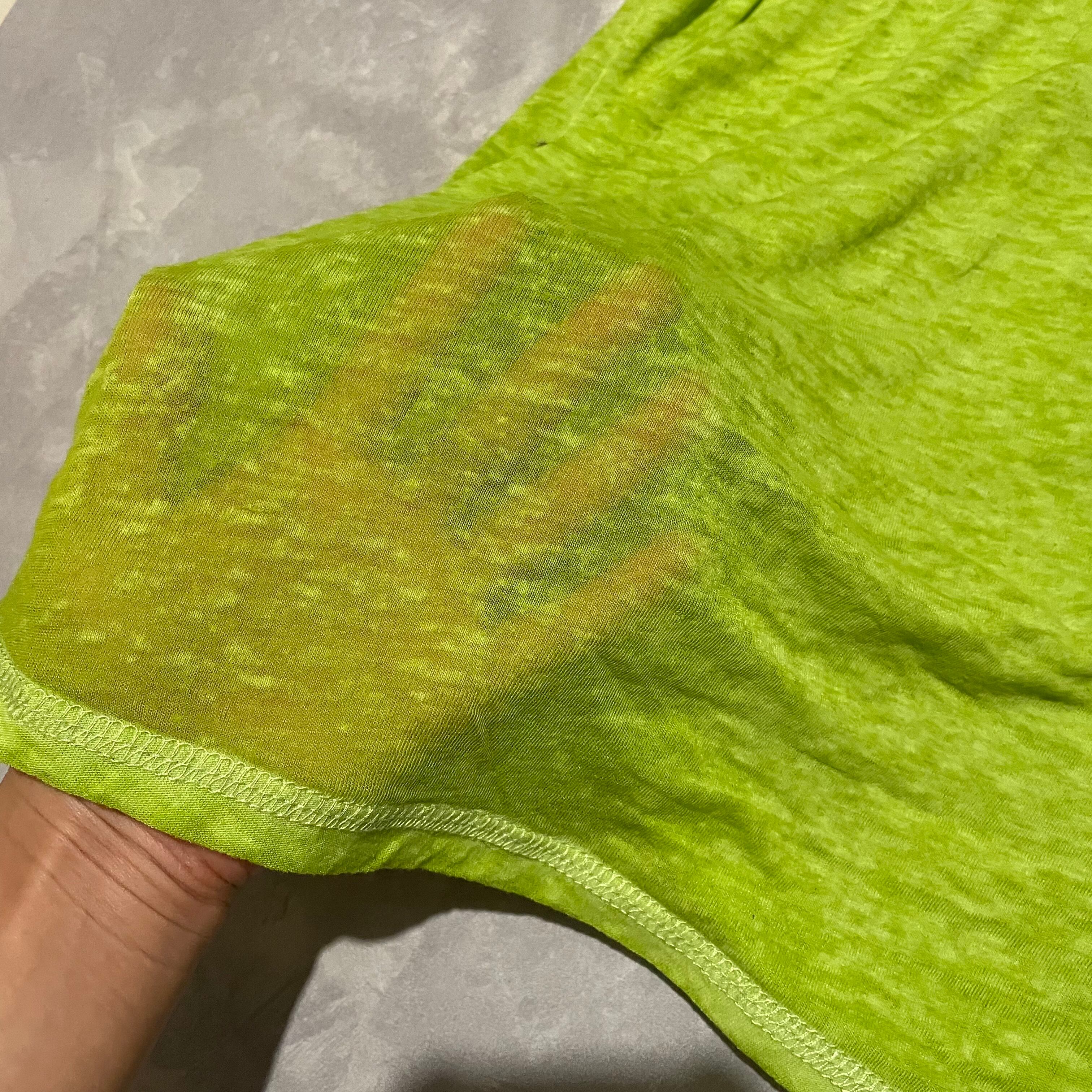 発色の良い yellow greenのシアー素材にAngelのプリントが魅力のt-shirt