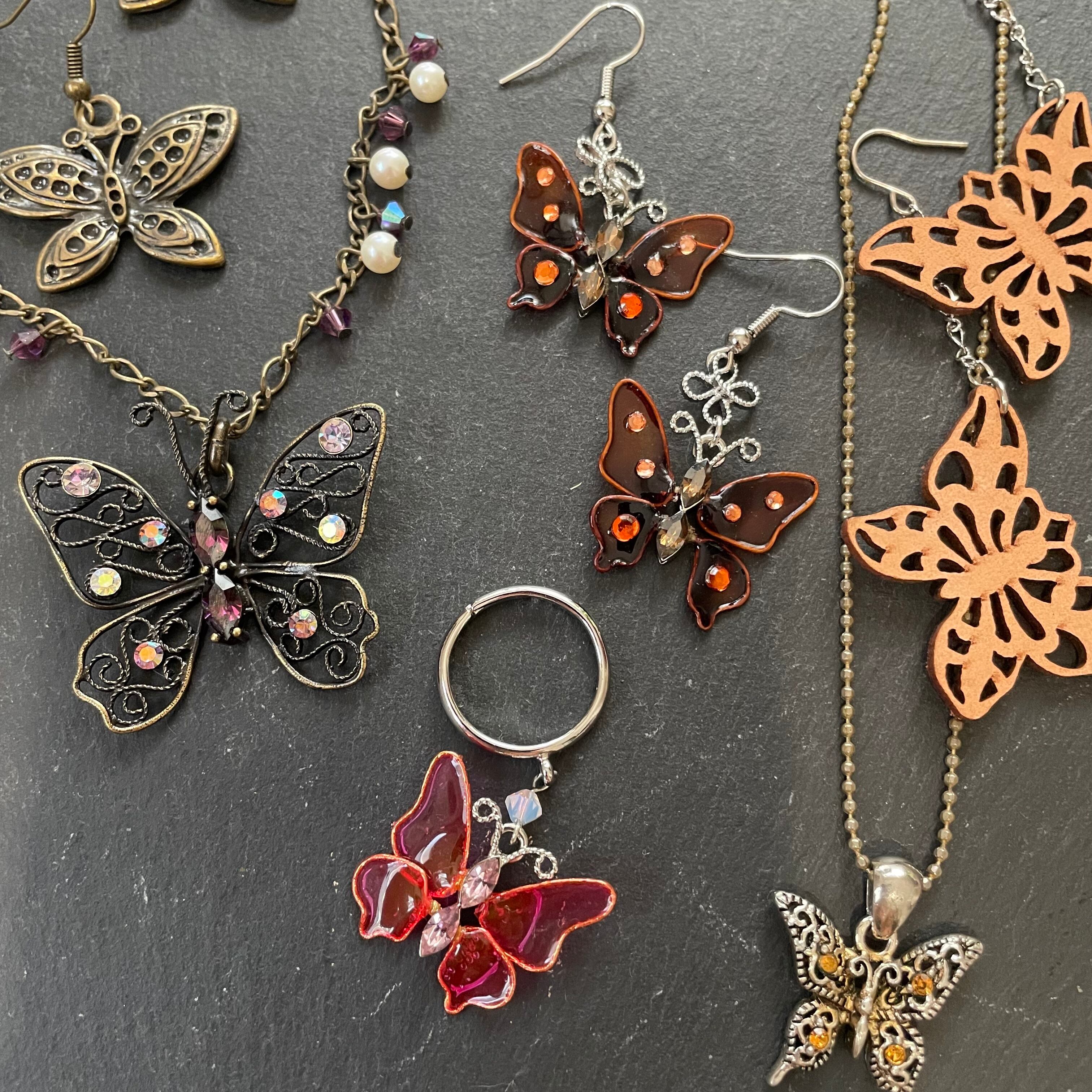 vintage goldにパープルのbeadsが映えるbutterfly necklace