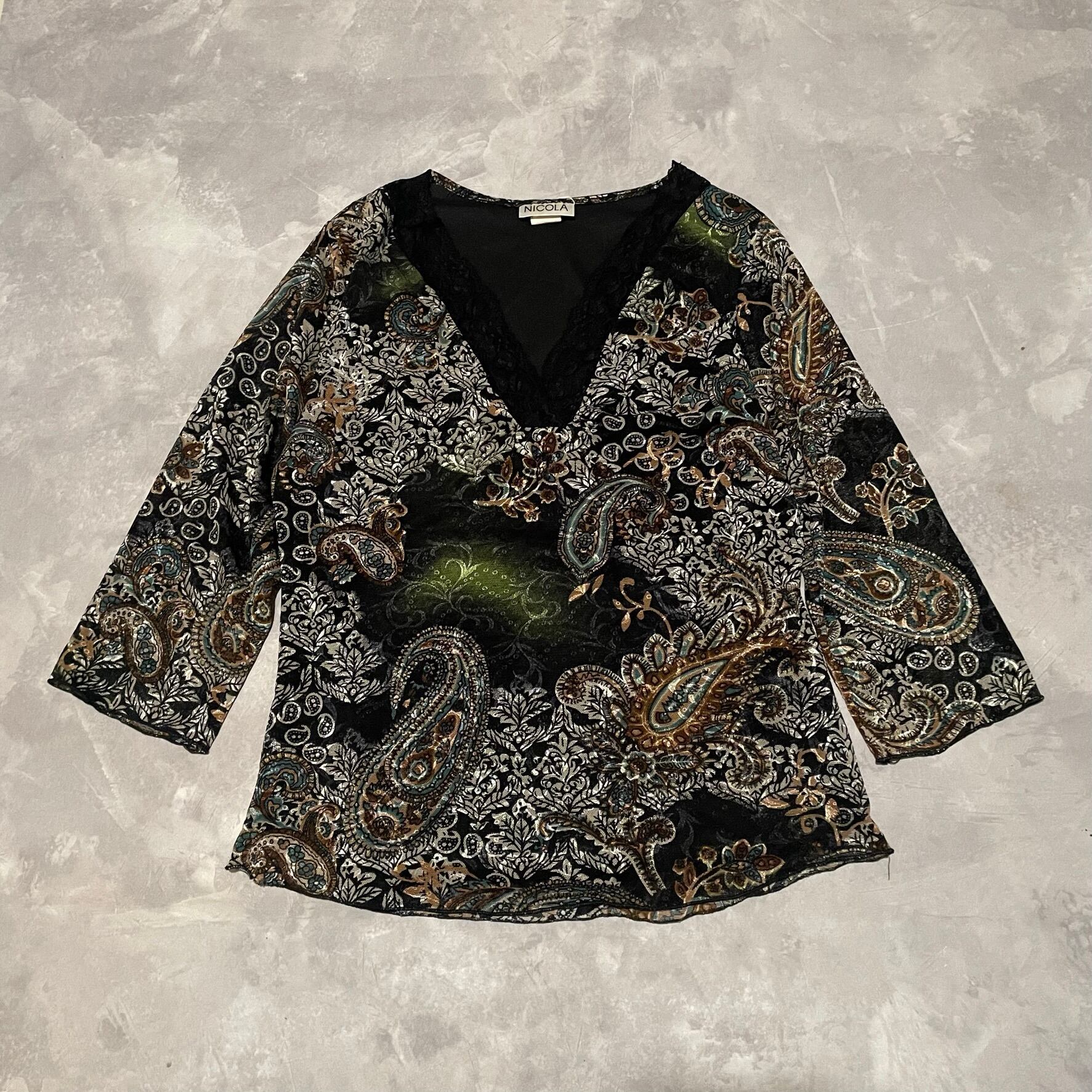 brownとgreenを基調にしたペイズリー柄が魅惑のカットソー