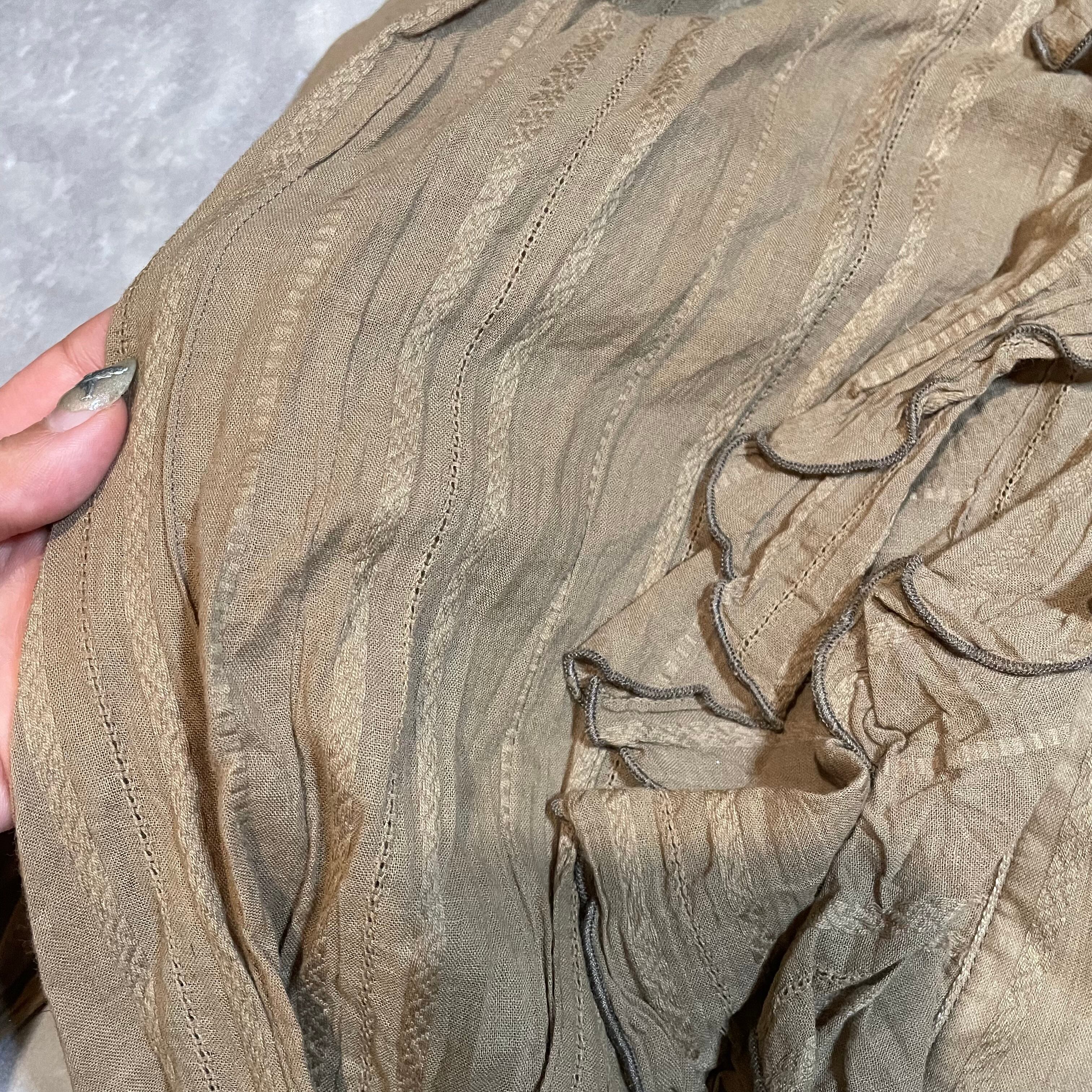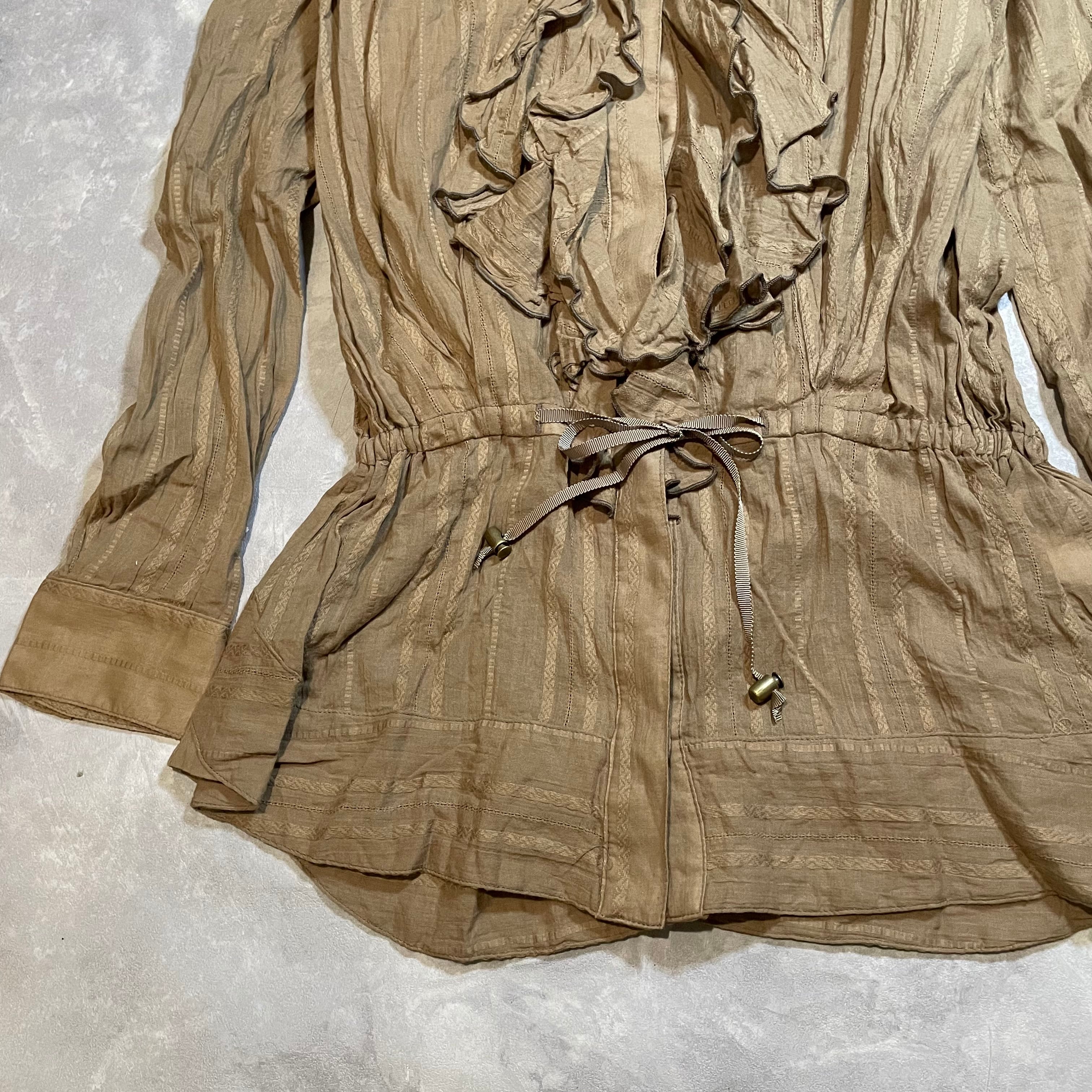 秋らしいキャメル colorのチュニック丈frill shirt