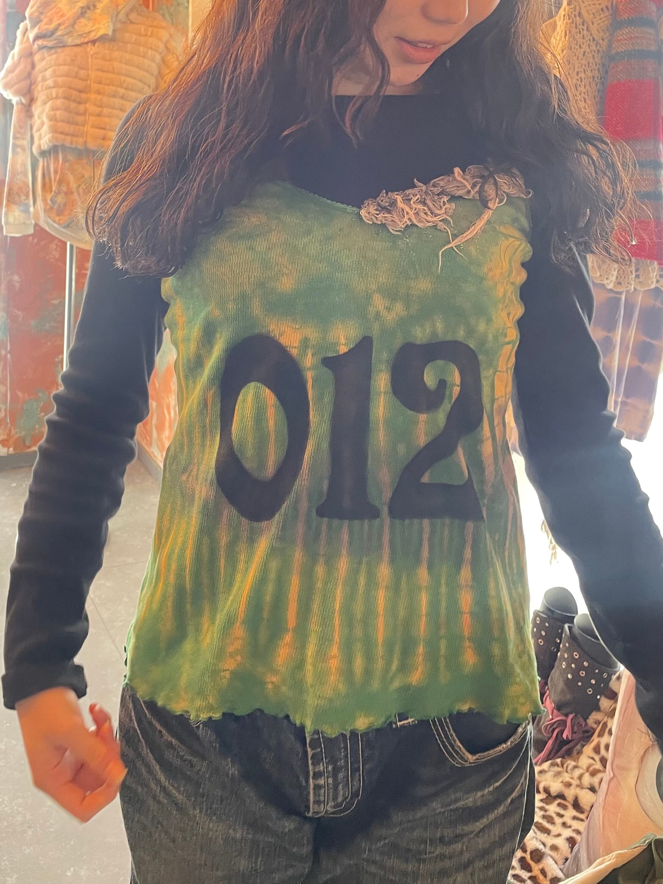 tie-dye柄のキャミソールにダメージのdenim生地を縫い付けベルトを連想させるdesignに