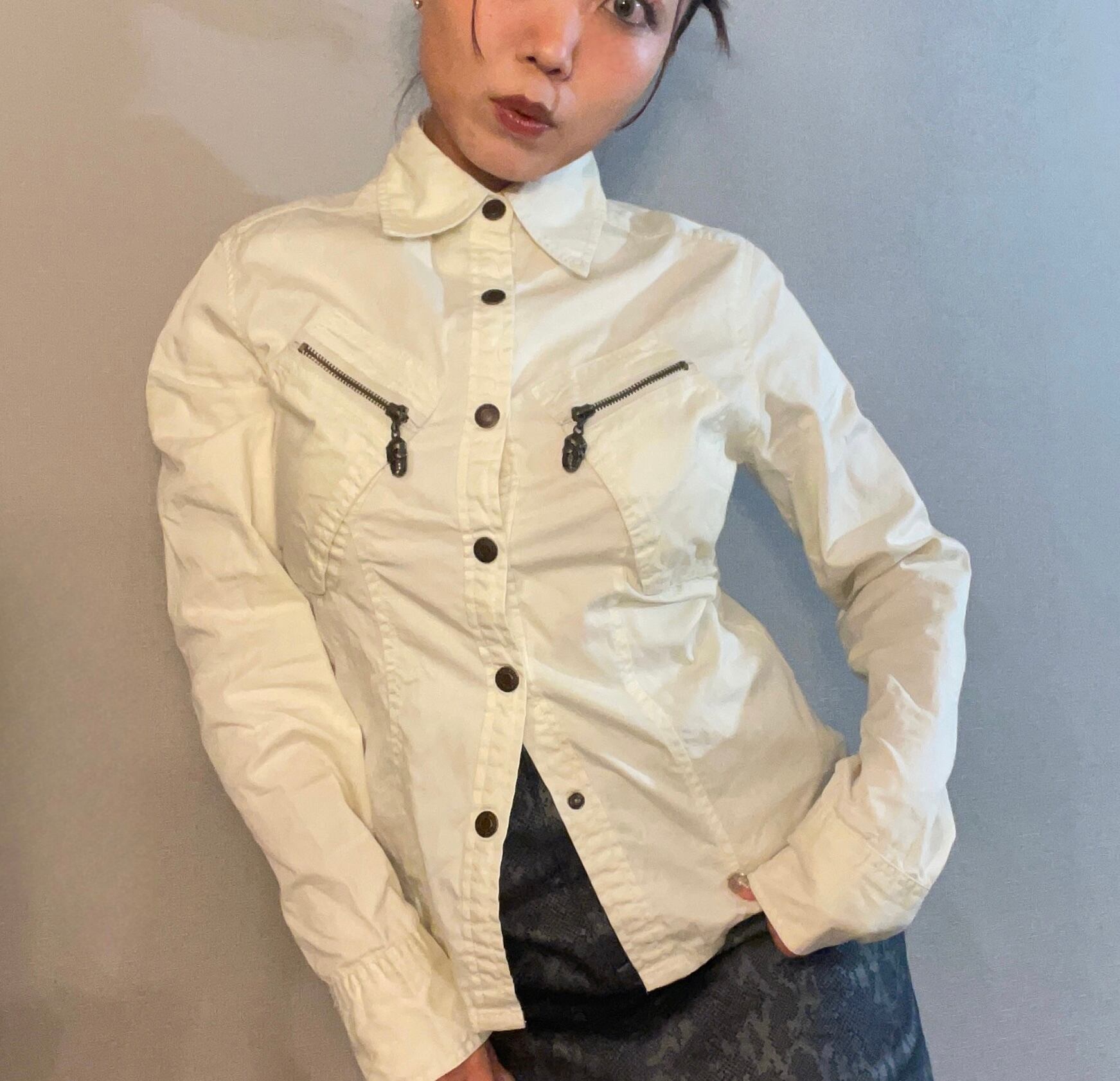 斜めにデザインされたpocketにskullのファスナーがmatchしたシャツ